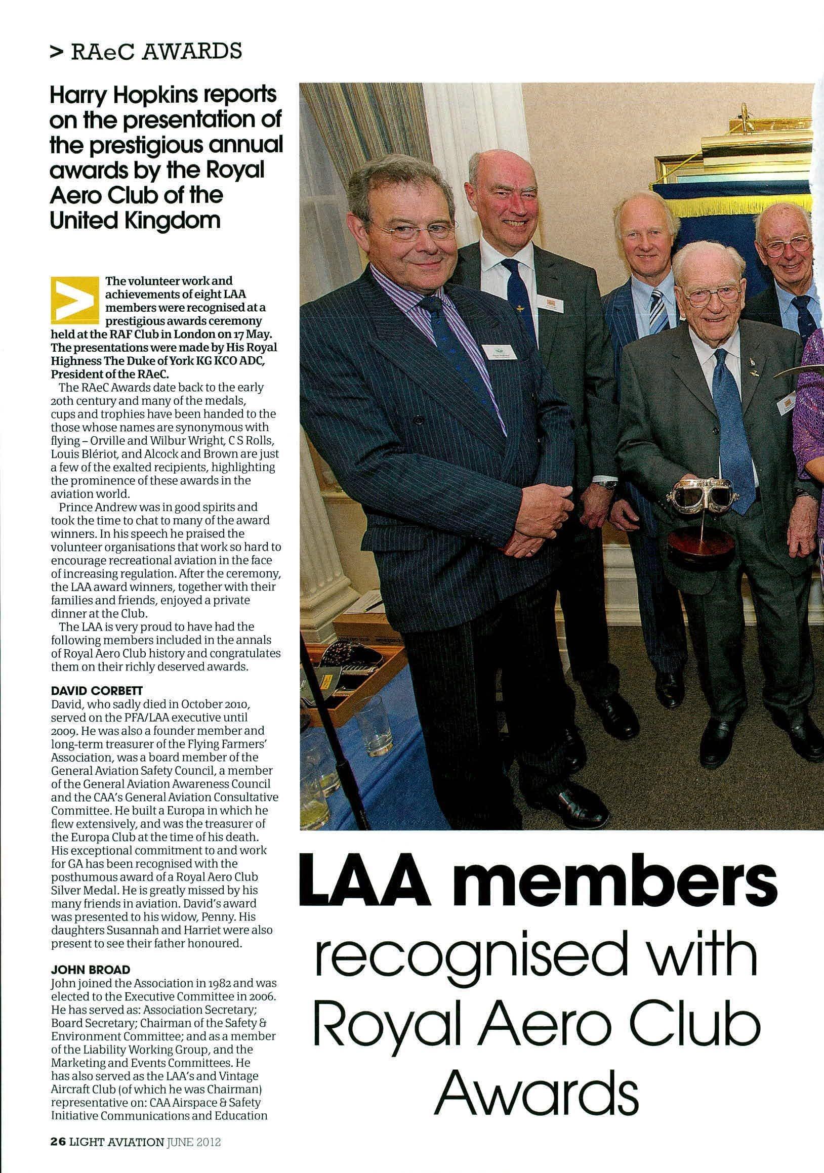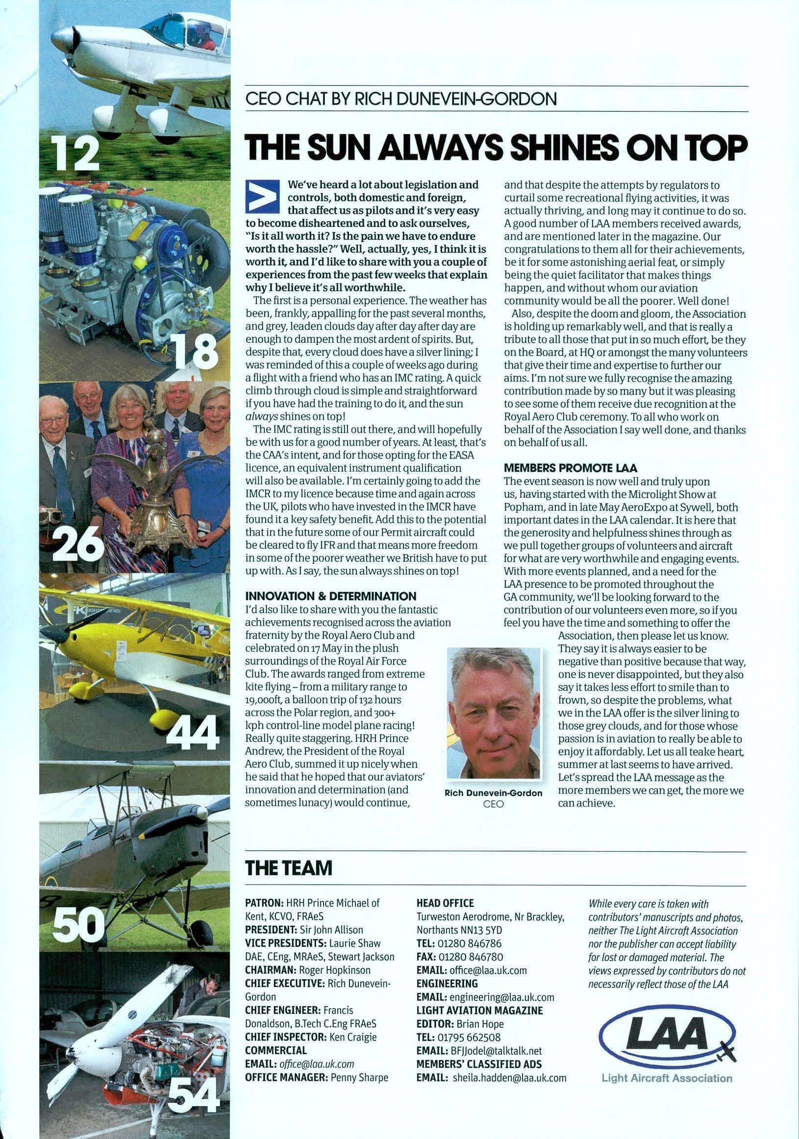 andthatdespitetheattemptsbyregulatorsto curtailsomerecreationalflyingactivities,itwas actuallythriving,andlongmayitcontinuetodoso. AgoodnumberofLAAmembersreceivedawards, andarementionedlaterinthemagazine.Our congratulationstothemallfortheirachievements, beitforsomeastonishingaerialfeat,orsimply beingthequietfacilitatorthatmakesthings happen,andwithoutwhomouraviation communitywouldbeallthepoorer.Welldone! Also,despitethedoomandgloom,theAssociation isholdingupremarkablywell,andthatisreallya tributetoallthosethatputinsomucheffort,bethey ontheBoard,atHQoramongstthemanyvolunteers thatgivetheirtimeandexpertisetofurtherour aims.I'mnotsurewefullyrecognisetheamazing contributionmadebysomanybutitwaspleasing toseesomeofthemreceiveduerecognitionatthe RoyalAeroClubceremony.Toallwhoworkon behalfoftheAssociationIsaywelldone,andthanks onbehalfofusall.