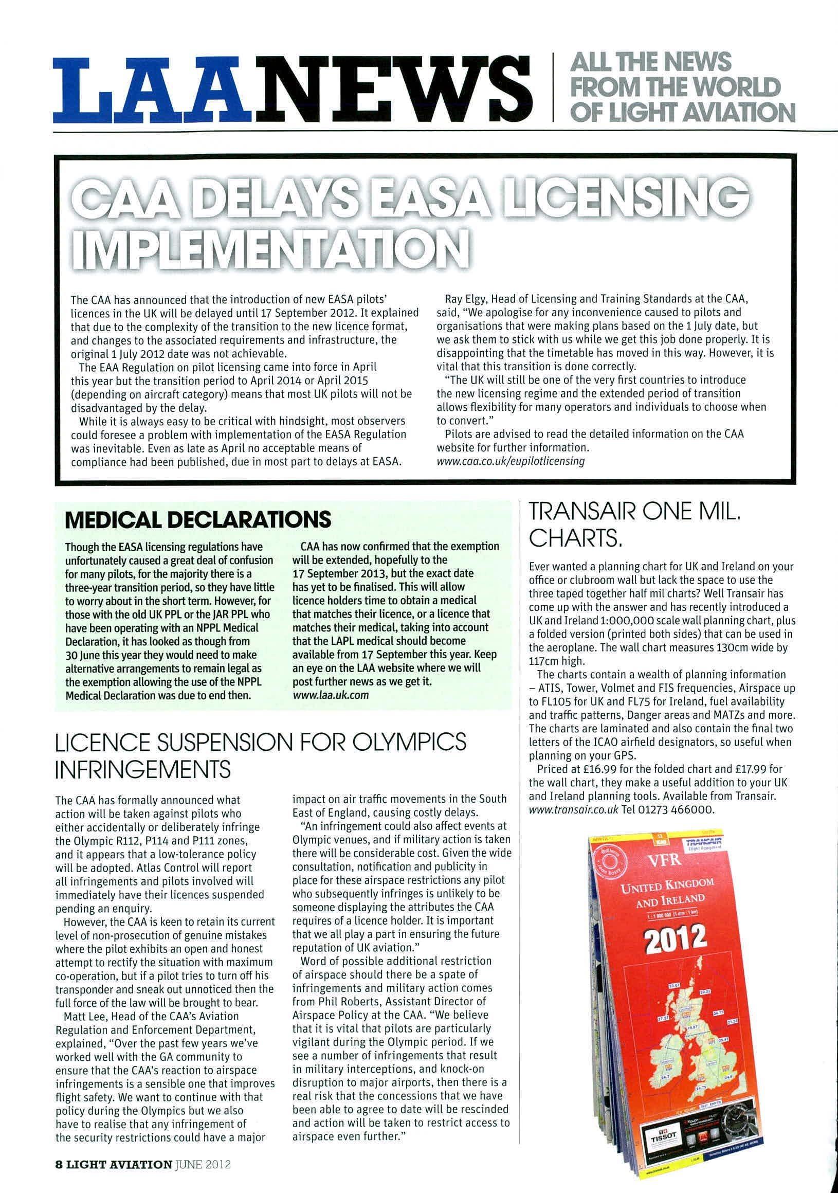 LAANEWS TheCAAhasannouncedthattheintroductionofnewEASApilots' licencesintheUKwillhedelayeduntil17September2012.Itexplained thatduetothecomplexityofthetransitiontothenewlicenceformat, andchangestotheassociatedrequirementsandinfrastructure,the originat1July2012datewasnotachievable.