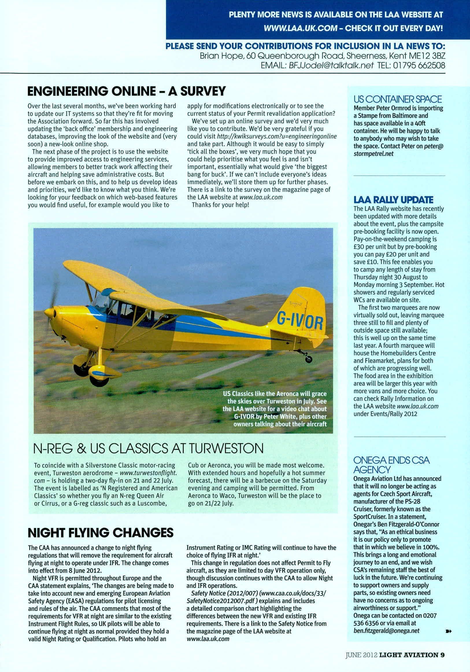 NIGHTFLYINGCHANGES TheCAAhasannouncedachangetonightflying regulationsthatwillremovetherequirementforaircraft flyingatnighttooperateunderIFR.Thechangecomes intoeffectfrom8June2012. NightVFRispermittedthroughoutEuropeandthe CAAstatementexplains,'Thechangesarebeingmadeto takeintoaccountnewandemergingEuropeanAviation SafetyAgency(EASA)regulationsforpilotlicensing andrulesoftheair.TheCAAcommentsthatmostofthe requirementsforVFRatnightaresimilartotheexisting InstrumentFlightRules,soUKpilotswillbeableto continueflyingatnightasnormalprovidedtheyholda validNightRatingorQualification.Pilotswhoholdan