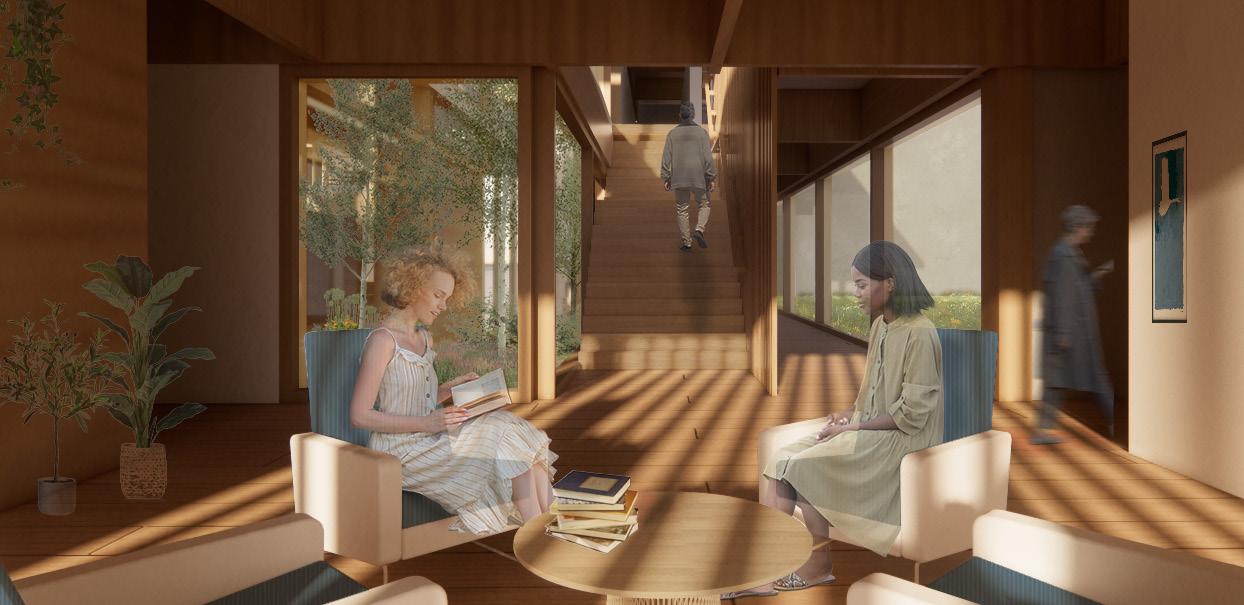 Return focused on helping individuals reconnect with cherished aspects of their lives as they approach their final days and offering individuals a choice to choose how they wanted to live. Recognizing that everyone copes with the end of life differently, the design emphasizes liberty and dignity, offering diverse spaces to support personal needs. Scenic views of Lake Ontario, tranquil courtyards, and carefully designed lighting provide comfort for those seeking connection with nature.