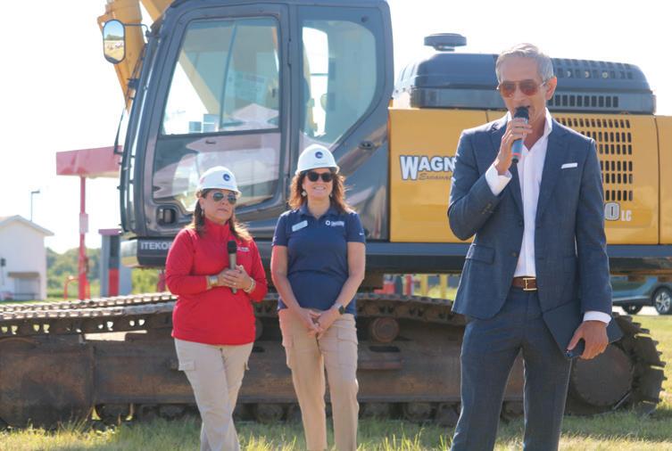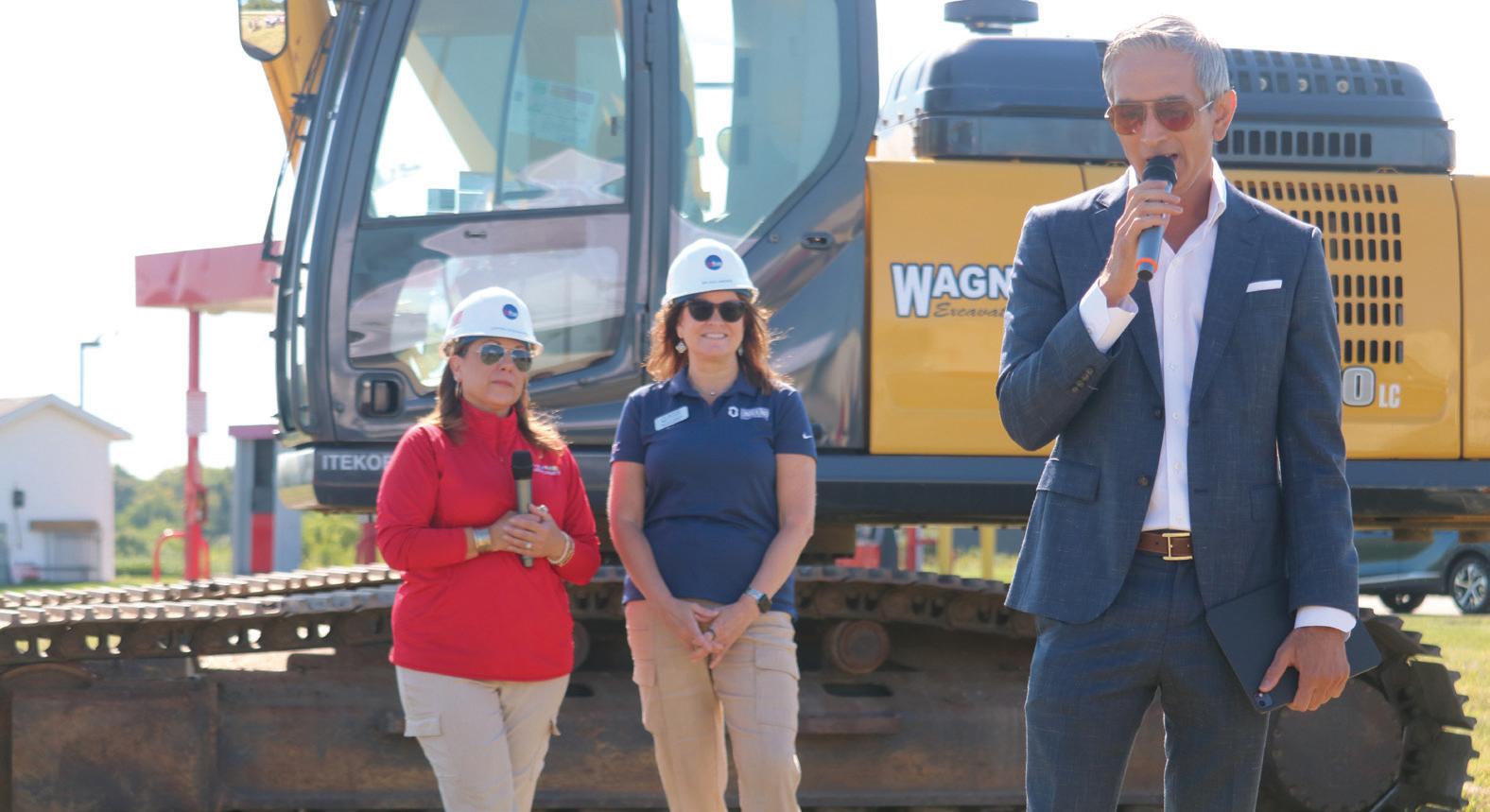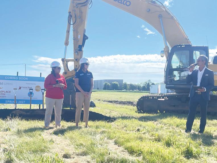 Pramit Patel (right) gives remarks Tuesday, Aug. 26, 2025, at a groundbreaking ceremony for a new Marriott-branded hotel, as Cortney Strohacker (left) and Melissa Amedeo watch on.