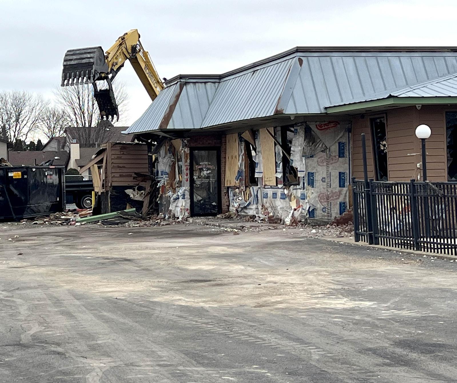 An excavator dumps debris from Tom & Jerry’s into a dumpster Feb. 19 as teardown is underway at the popular Sycamore restaurant after it was destroyed by fire Jan. 31.