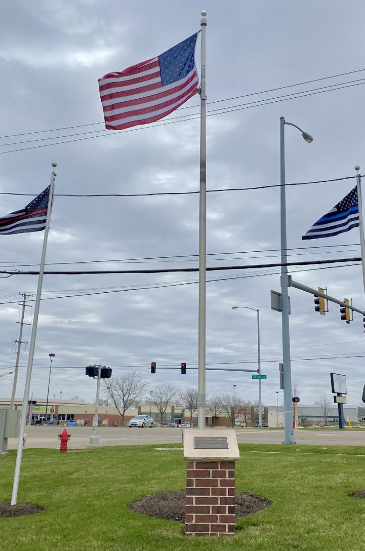 The DeKalb County First Responder Memorial along Sycamore Road across from Hy-Vee includes flags and a plaque built for the late DeKalb County Sheriff’s Deputy Christina Musil, who was killed while on duty in a DUI crash on March 29, 2024.