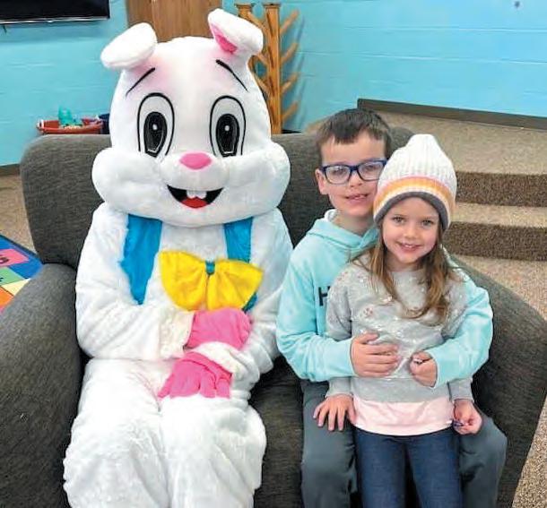 FAR LEFT: SiblingsJase and Kaley Jepson of Erie get their photo taken with the Easter Bunny at the library during Revitalize Erie’s Easter Egg Scavenger Hunt on Saturday, April 1. The eventfeatured 17 participating locations this year, eachwith their owngames, prizes and crafts.