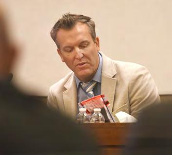 Defense attorney Christopher DeRango (left) cross-examines Illinois State Police Special Agent Nate Macklin (right) on Jan. 16 about text messages and other data extracted in 2016 from the cellphone of Duane C. Meyer (center).