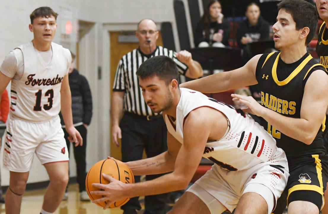 Forreston’s Mickey Probst protects the ball against AFC’s Naim Mimini on Jan. 17 at Forreston High School. High school sports roundup on page 14.