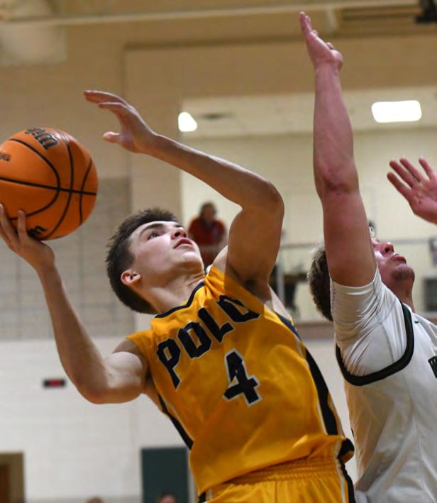 TOP LEFT: Polo’s JT Stephenson battles West Carroll’s Ryker Budimlija for a rebound during 1A regional action in Mt. Carroll on Monday, Feb. 23. TOP RIGHT: West Carroll’s Roger LaBorn handles the ball as Polo’s Eli Perez defends during 1A regional action. ABOVE: Polo’s Jordan Reed drives to the basket against West Carroll on Monday, Feb. 23. LEFT: Polo’s Mercer Mumford shoots against West Carroll.
