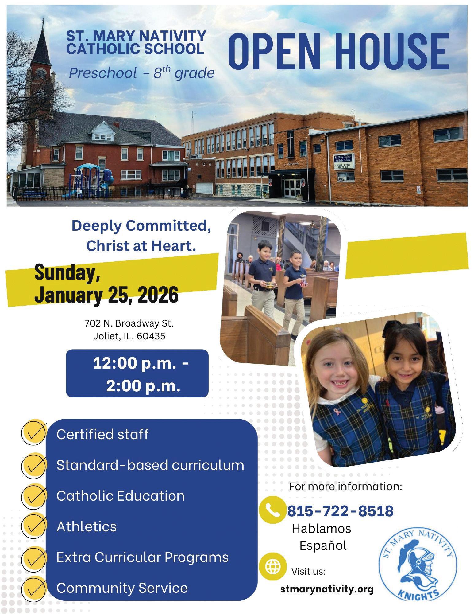 • Sunday, January 25: Celebrating Our Parish. Join us at 11:00 a.m. Mass, followed by our Open House from 12:00–2:00 p.m.! Tour the classrooms, meet teachers and families, and explore our legacy “Through the Decades.” Alumni—we’d love to welcome you back!