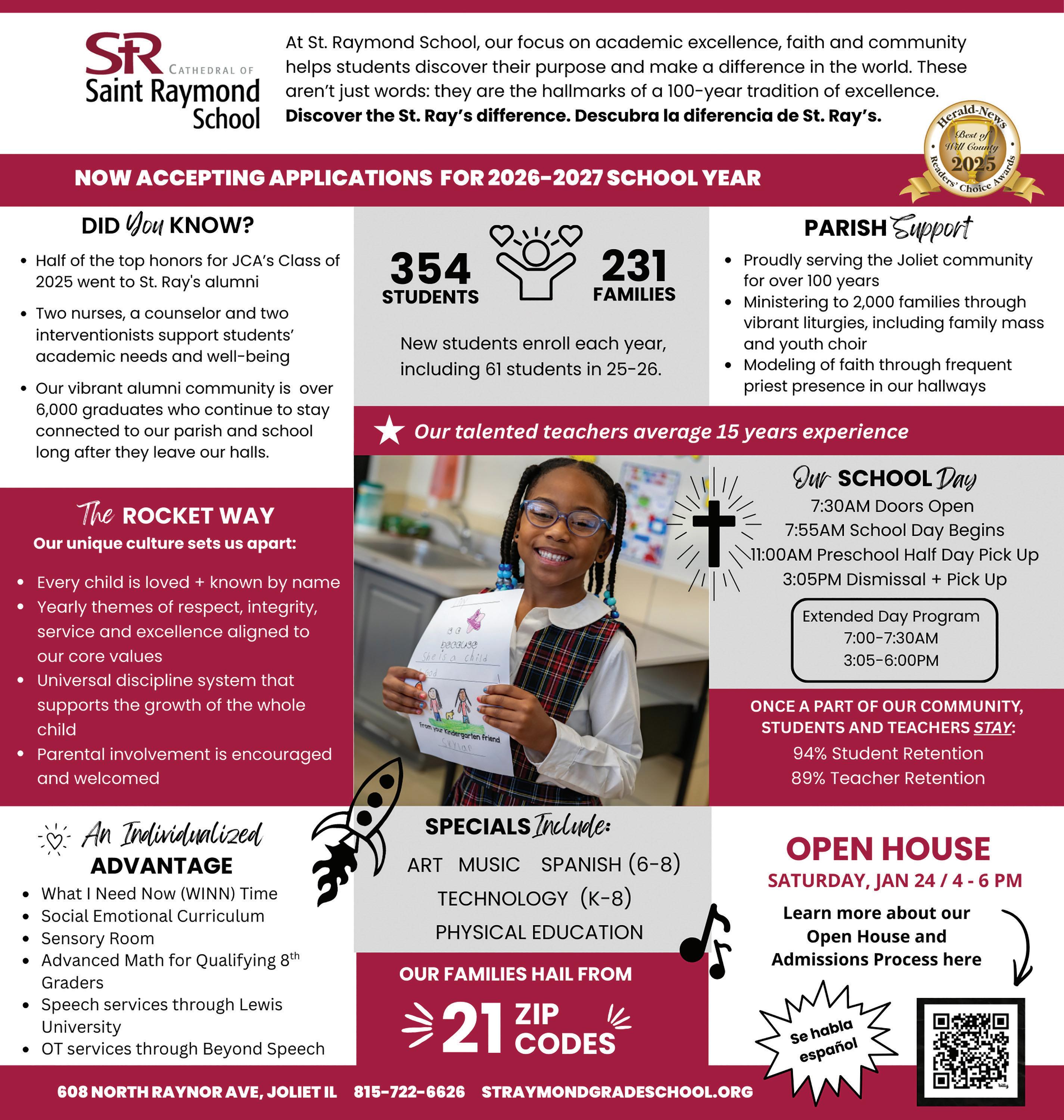 More information about our school can be found at www.straymondgradeschool. org and Facebook and Instagram at @CathedralofStRaymond.