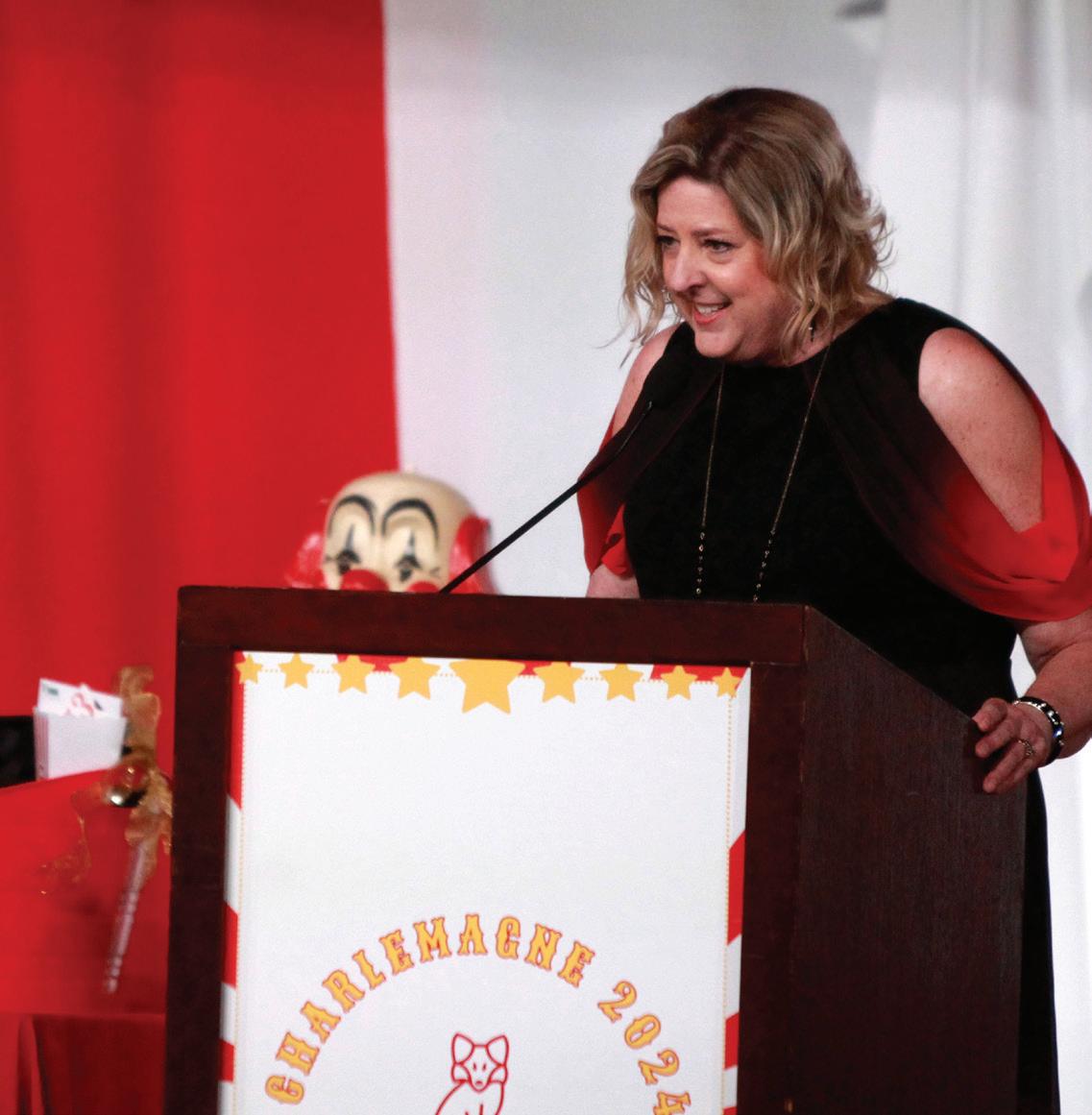 Deborah Gurley, executive director of the St. Charles Area Chamber of Commerce, addresses the audience during the 56th Annual Charlemagne Awards Dinner at the Q Center in St. Charles on Friday, May 17, 2024.