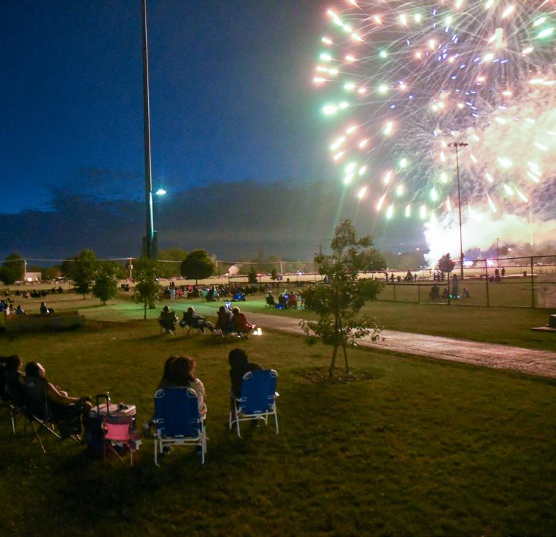 David Toney for Shaw Local News Network Fireworks light up the night sky as community members watch the fireworks display at Prairie Point Community Park in Oswego on Thursday July 4, 2024.