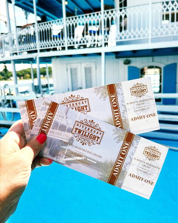 Riverboat Twilight, docked at 199 Front St. in LeClaire, Iowa, offers 1- and 2-day cruises, as well as 90-minute sightseeing journeys from May to October. The 1-day tour goes from Dubuque to Guttenburg, Iowa, the 2-day tour from LeClaire to Dubuque, and the short sightseeing tour from LeClaire goes to Princeton, Iowa. Find it on Facebook, Instagram and YouTube, go to riverboattwilight.com or call 1-800331-1467 for an up-to-date cruise schedule and an interior boat tour.