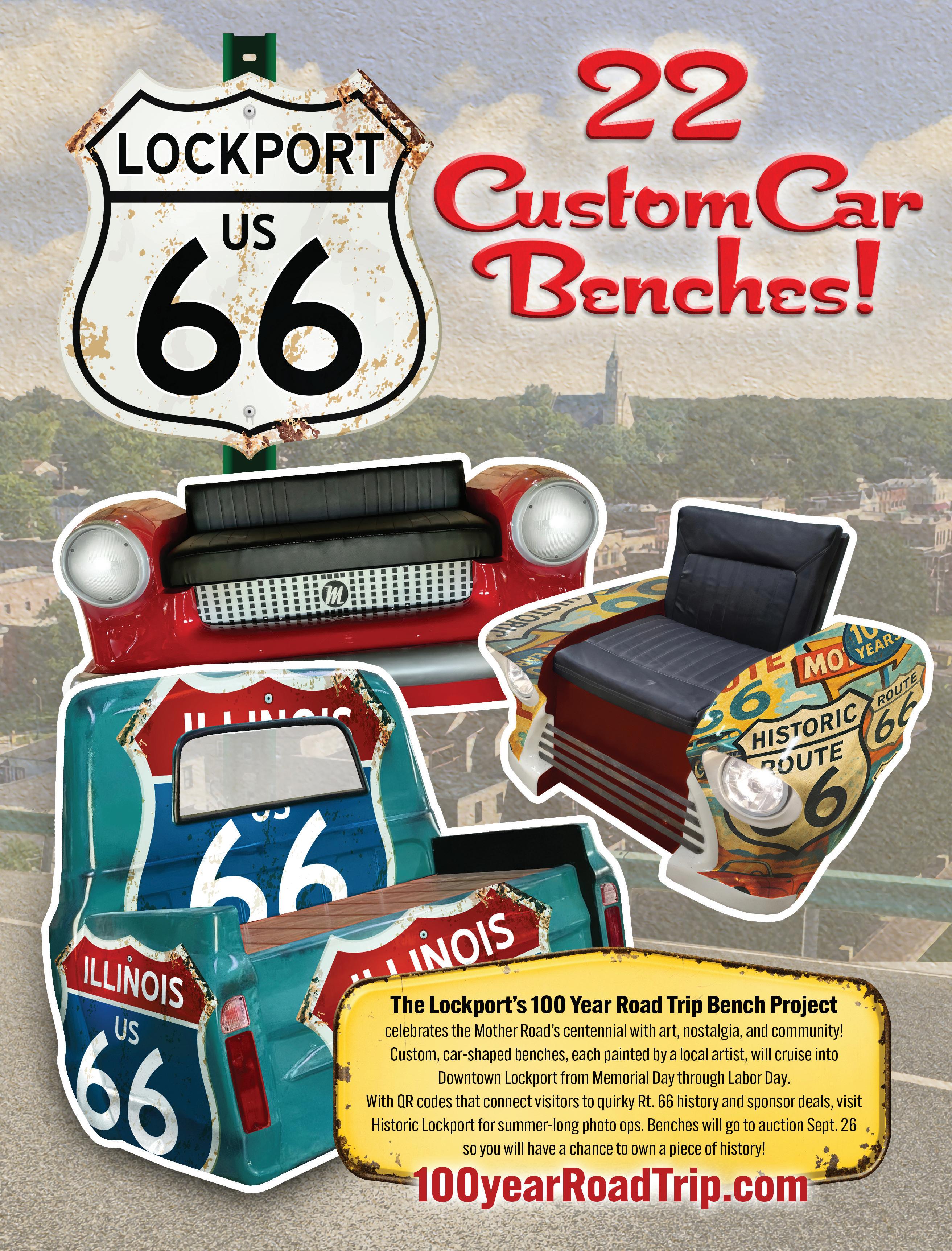 This summer will be especially meaningful as we proudly celebrate the Route 66 Centennial right here in Lockport. One of the highlights will be a truly one-of-akind public art experience: 22 custom car-bumper benches displayed throughout downtown. Each bench has been created by a local artist, blending creativity, history, and hometown pride while honoring Lockport’s place along the Mother Road. These benches will invite residents and visitors alike to slow down, take a seat, and enjoy our downtown in a whole new way.