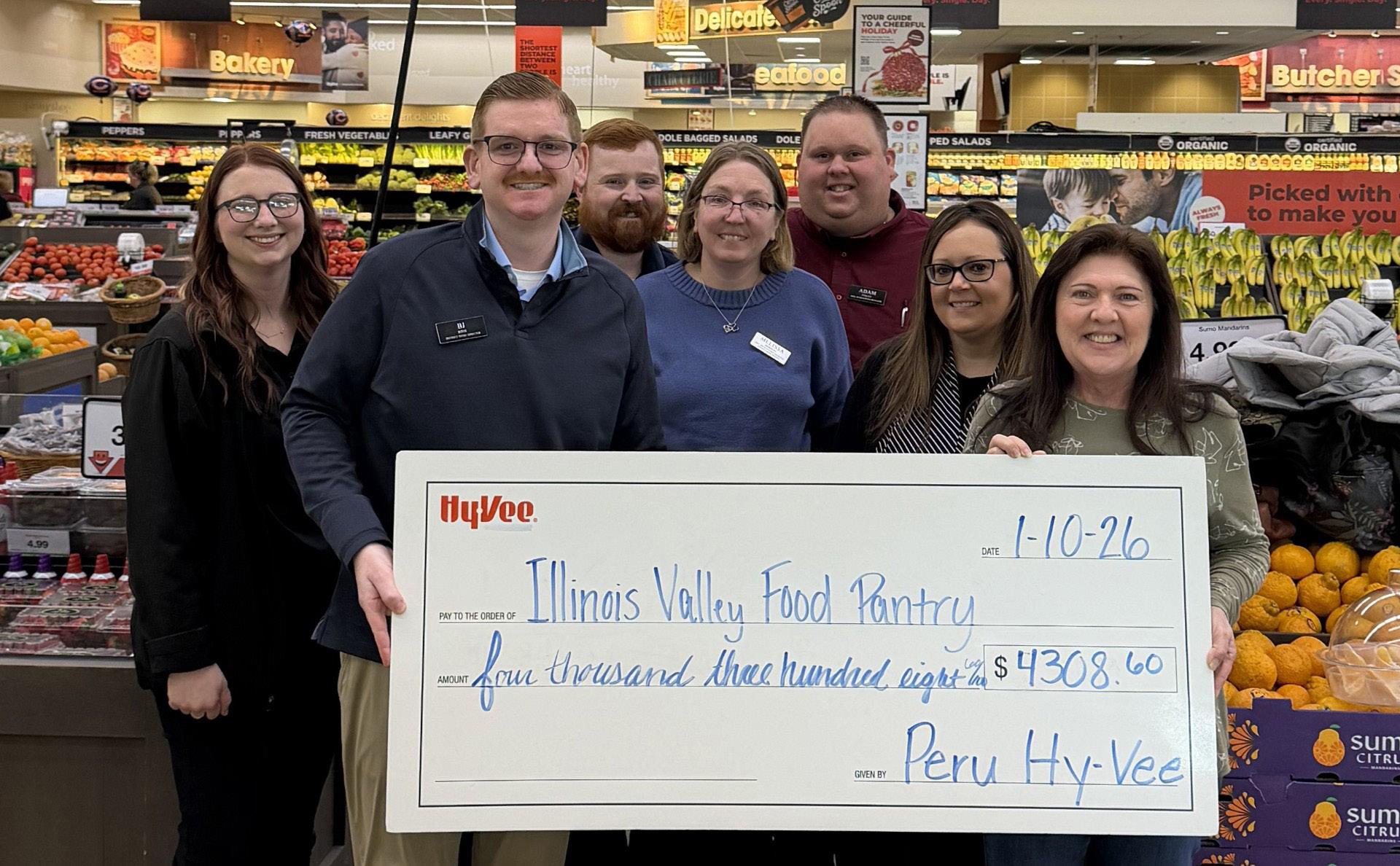 “The Illinois Valley Food Pantry is so very grateful for the support our Peru Hy-Vee and its employees provide to not just our pantry, but other pantries and charitable organizations in our community,” Illinois Valley Food Pantry Executive Director MJ Credi said. “The generosity and support the entire Hy-Vee staff shows for this community’s charitable organizations is absolutely wonderful.”