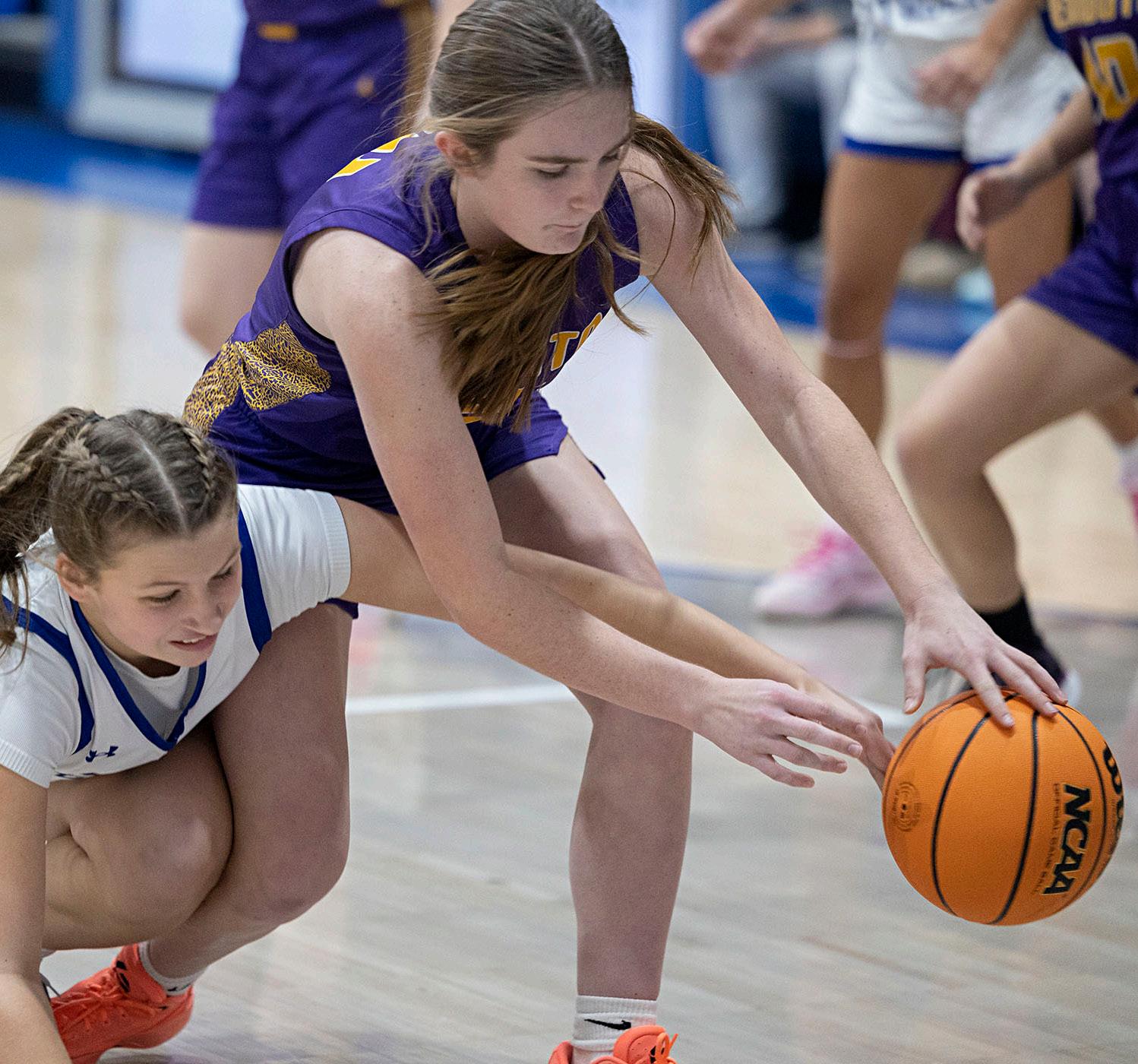 Mendota’s Karson Doyle (right) and Newman’s Veronica Haley work for a loose ball in a Dec. 4, 2025, game.
