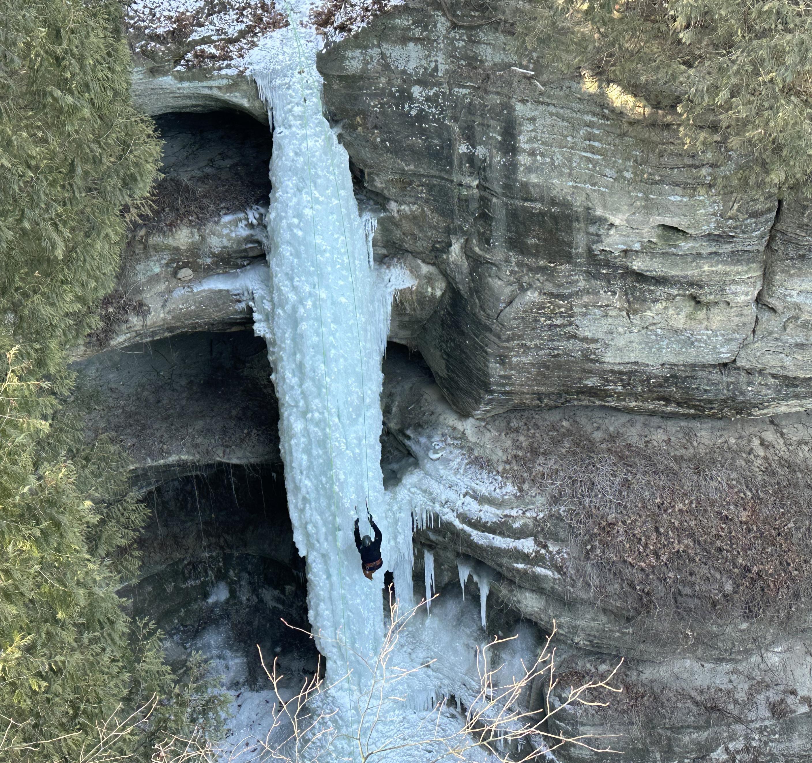 An ice climber scales an 80-foot frozen waterfall Jan. 24, 2025, inside Wildcat Canyon at Starved Rock State Park.