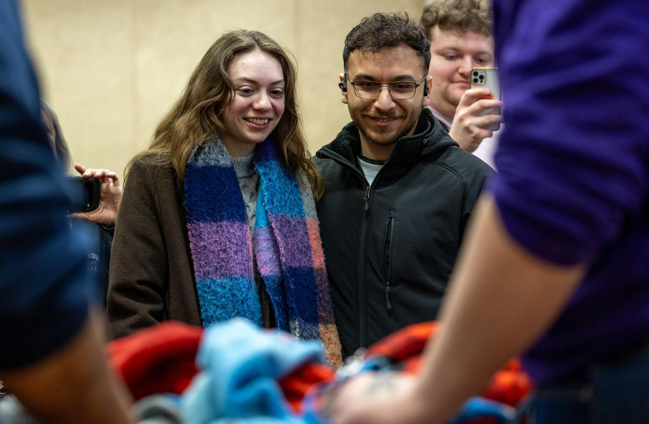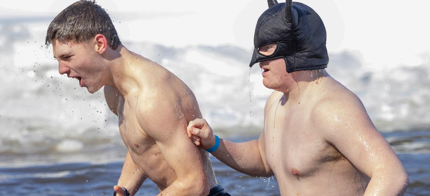 Two plungers flee the icy waters during the Polar Plunge for Special Olympics on Feb. 22, 2025 at Lake Mendota.