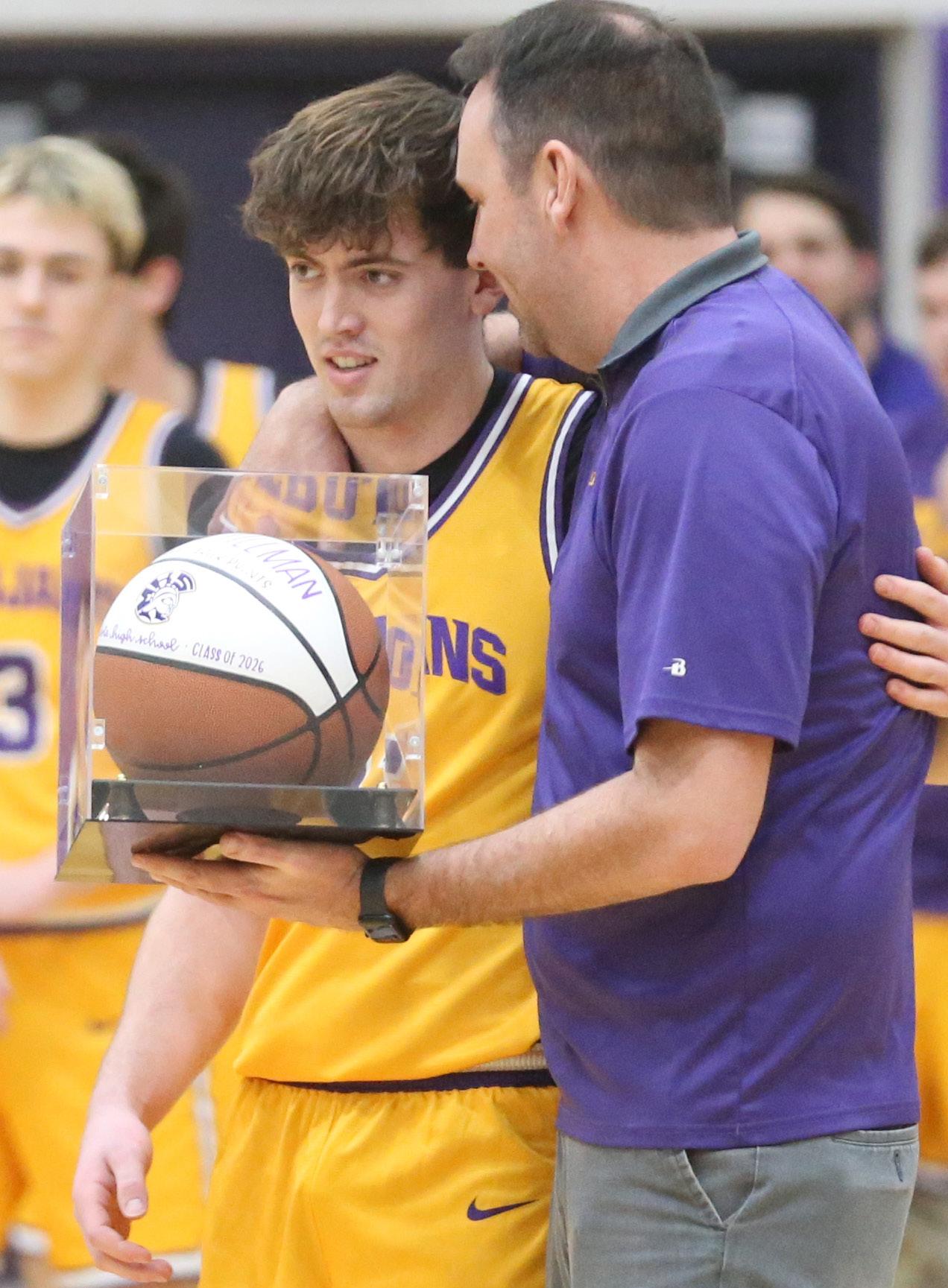 Mendota head boys basketball coach Steve Wasmer hands Aden Tillman a commemorative basketball on Feb. 3 after scoring his 1,000th career point at Mendota High School.