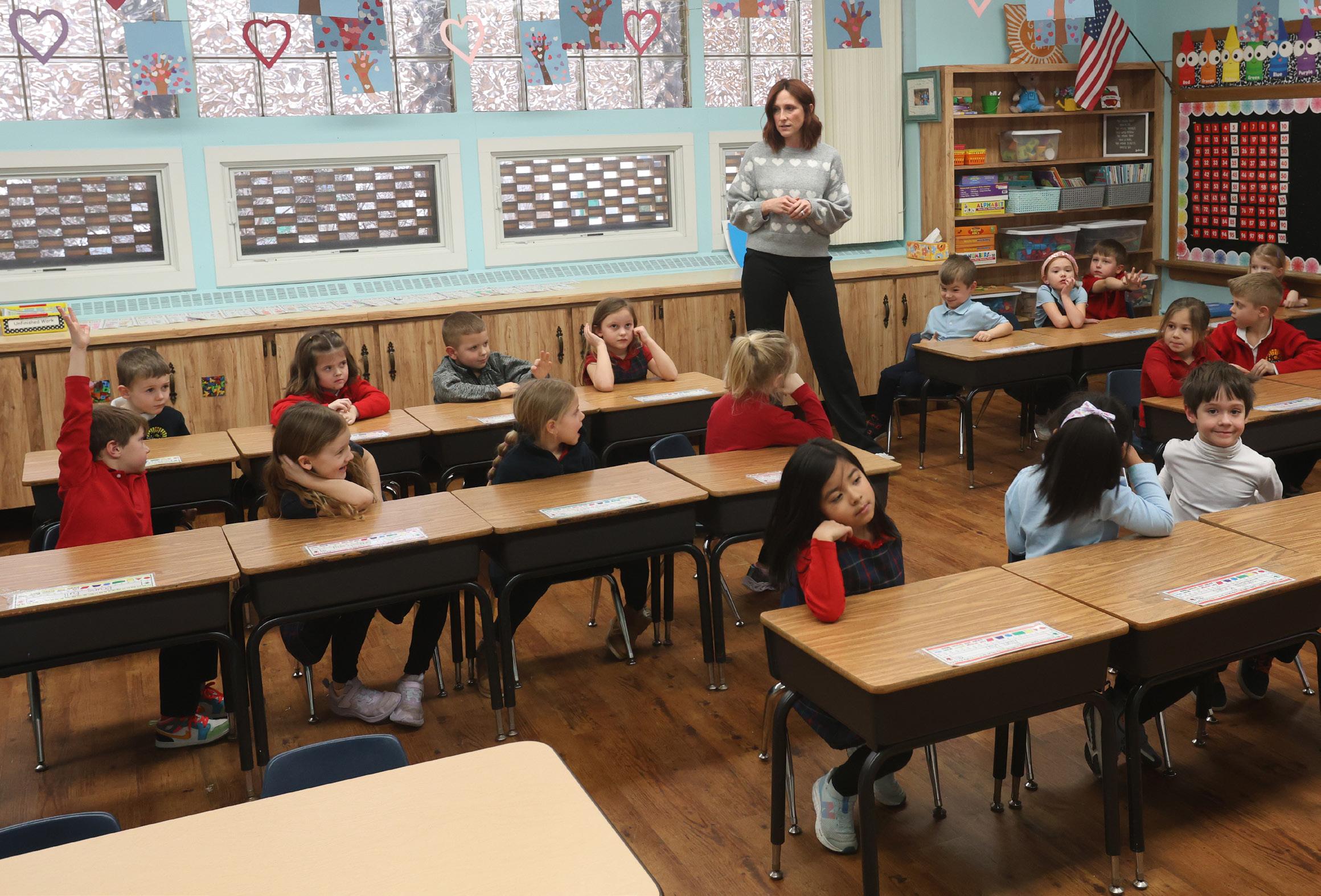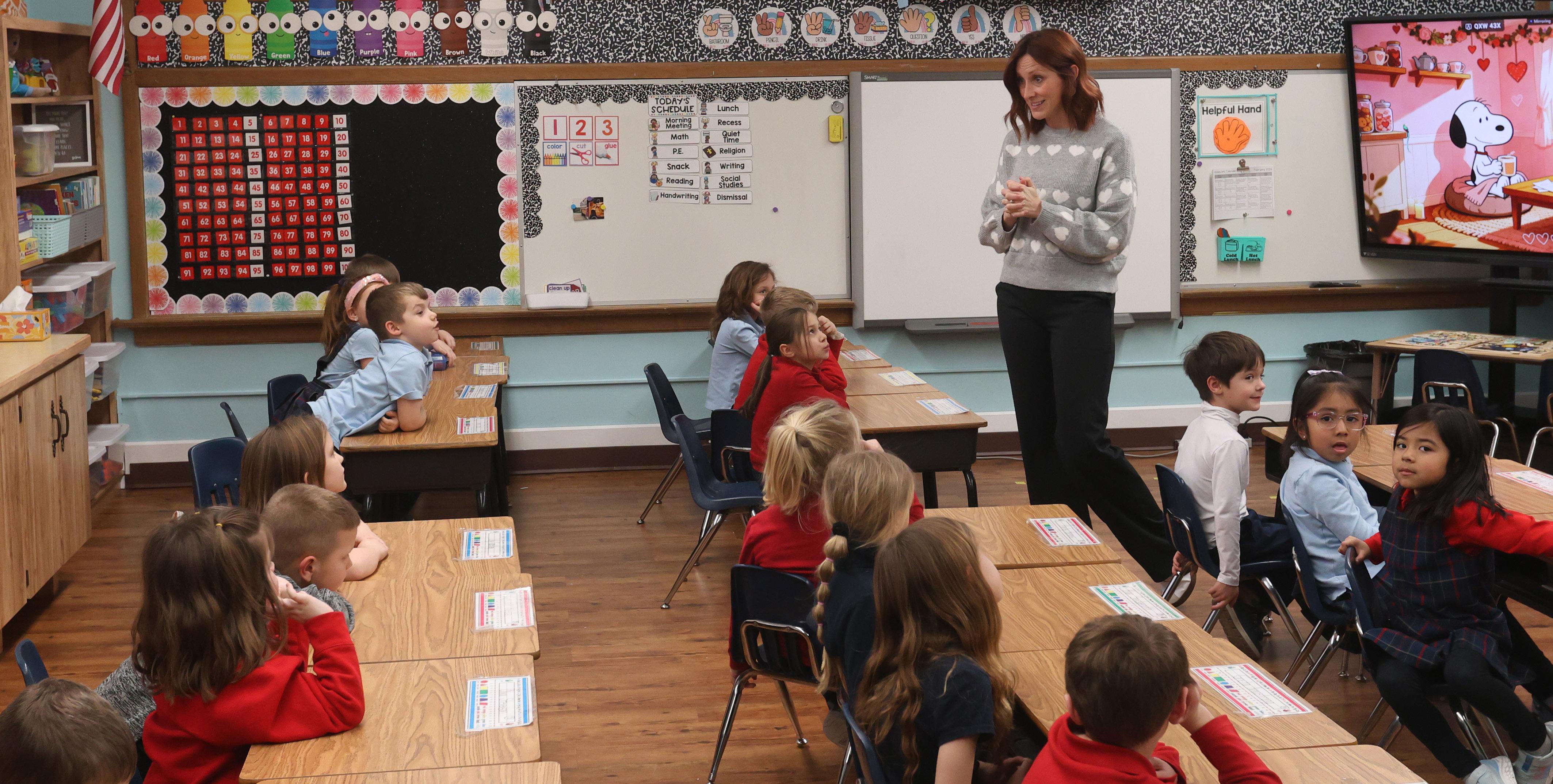 Mrs. Katie Henkel teaches her kindergarten class on Feb. 5, at Holy Cross Elementary School in Mendota. Henkel recently did a “name that kindergartener” trend through the school’s Facebook page. It has generated more than 22,000 views.
