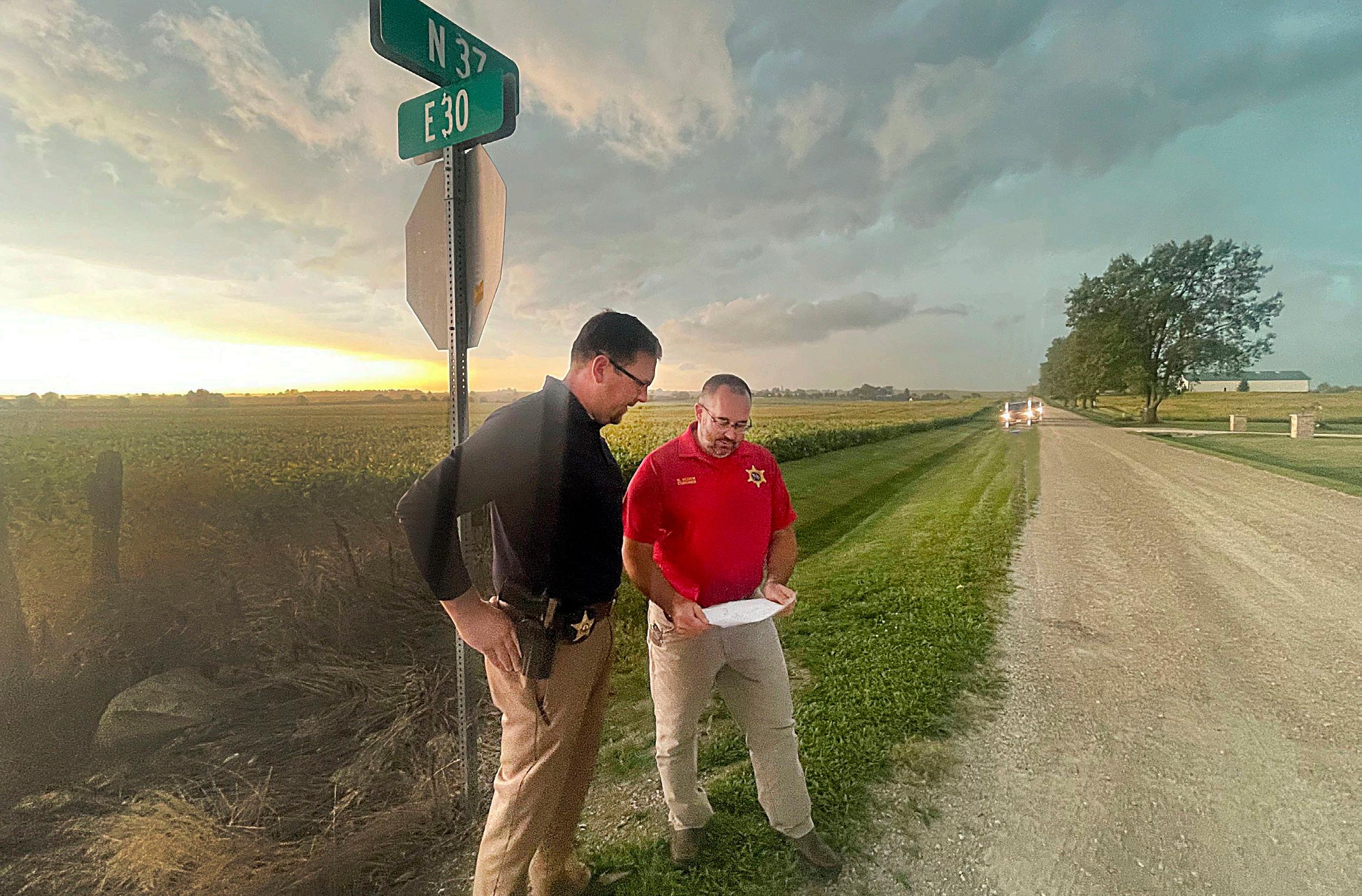 La Salle County Sheriff Adam Diss and La Salle County coroner Richard Ploch look at a map in 2021 showing where a Jane Doe was found in La Salle County. Scott Anderson file photo ON THE COVER