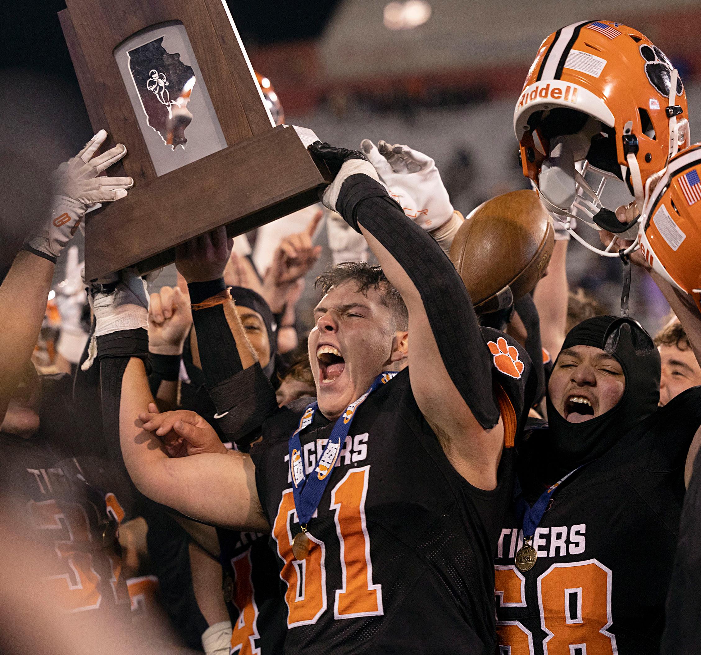 Byron’s Kade Politsch lifts the first place trophy as Byron celebrates their 56-50 win over Tolono-Unity Nov. 28 in the Class 3A football finals at Hancock Stadium at ISU.