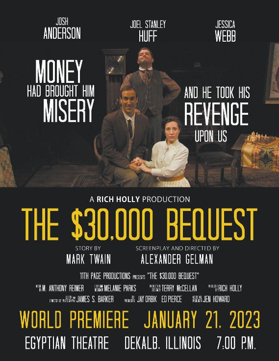 In a small town which boasts about 6,000 residents lives a young couple. Saladin and Electra are both practical and diligent in all their endeavors. Their lives are happy. One day, they receive news from a distant relative Tilbury Foster, from a neighboring state, who mentions that he would be leaving $30,000 bequest for them in his will, provided that they make no inquiries about him and do not attend his funeral. So begins our tale, originally told by Mark Twain now retold by DeKalb filmmakers in this full-length motion picture. Come be the first to see this world premiere event. More: niuarts.com/bequest-movie