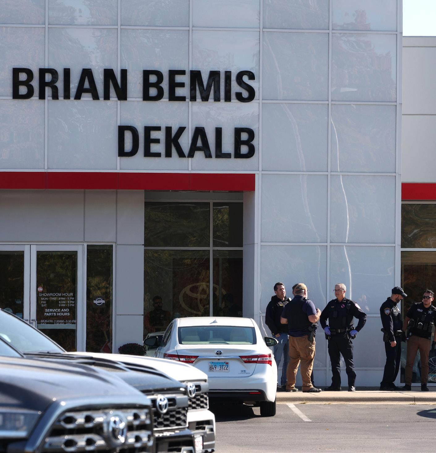 Law enforcement officers gather Oct. 23, 2024, outside of the Brian Bemis Toyota car dealership in DeKalb after responding to a stabbing where an employee was injured. The incident ended after police shot the man wielding the knife, authorities said.