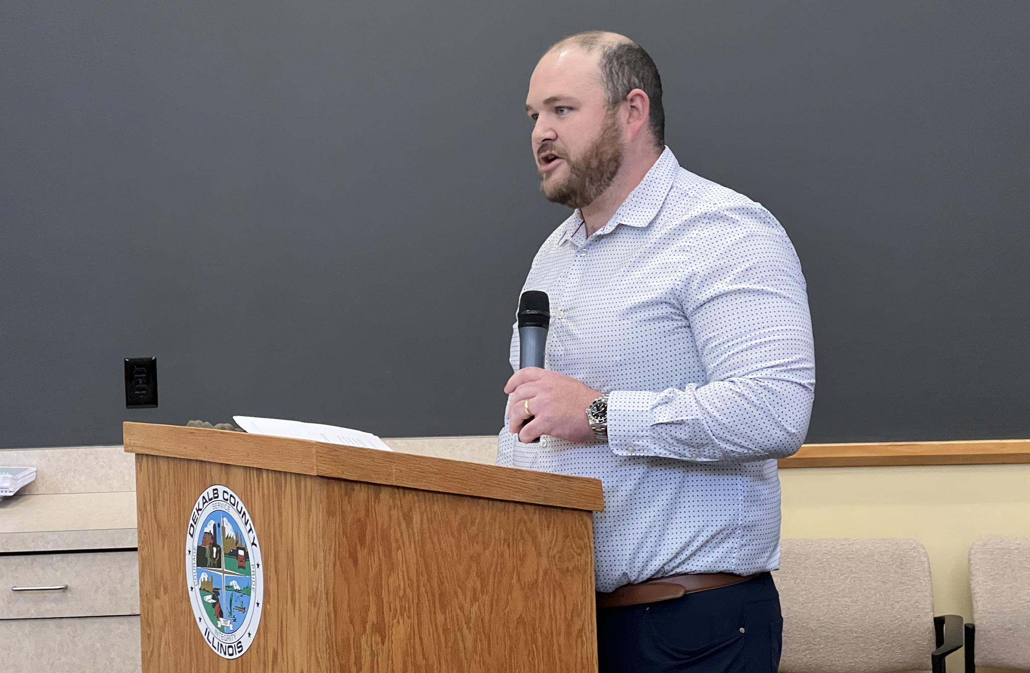 Hamilton Carrier, the project developer for a 49.1-acre 5-megawatt solar garden in Squaw Grove Township by Ironwood Renewables and Shenandoah Solar, speaks to the DeKalb County Board on June 26.