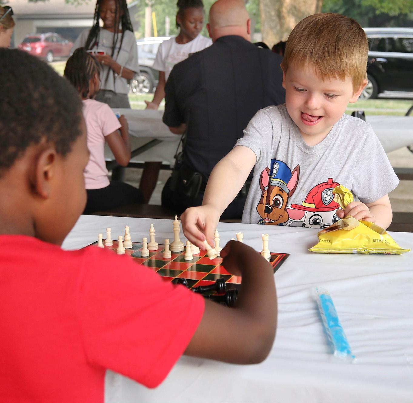 Westin Fickas, 6, (right) from DeKalb, makes a chess move June 27 during Fun Jam in the Park at Welsh Park in DeKalb. Fun Jam in the Park offers constructive activities for kids from 5 to 7 p.m. Tuesdays and Thursdays through Aug. 8 at various parks in DeKalb.