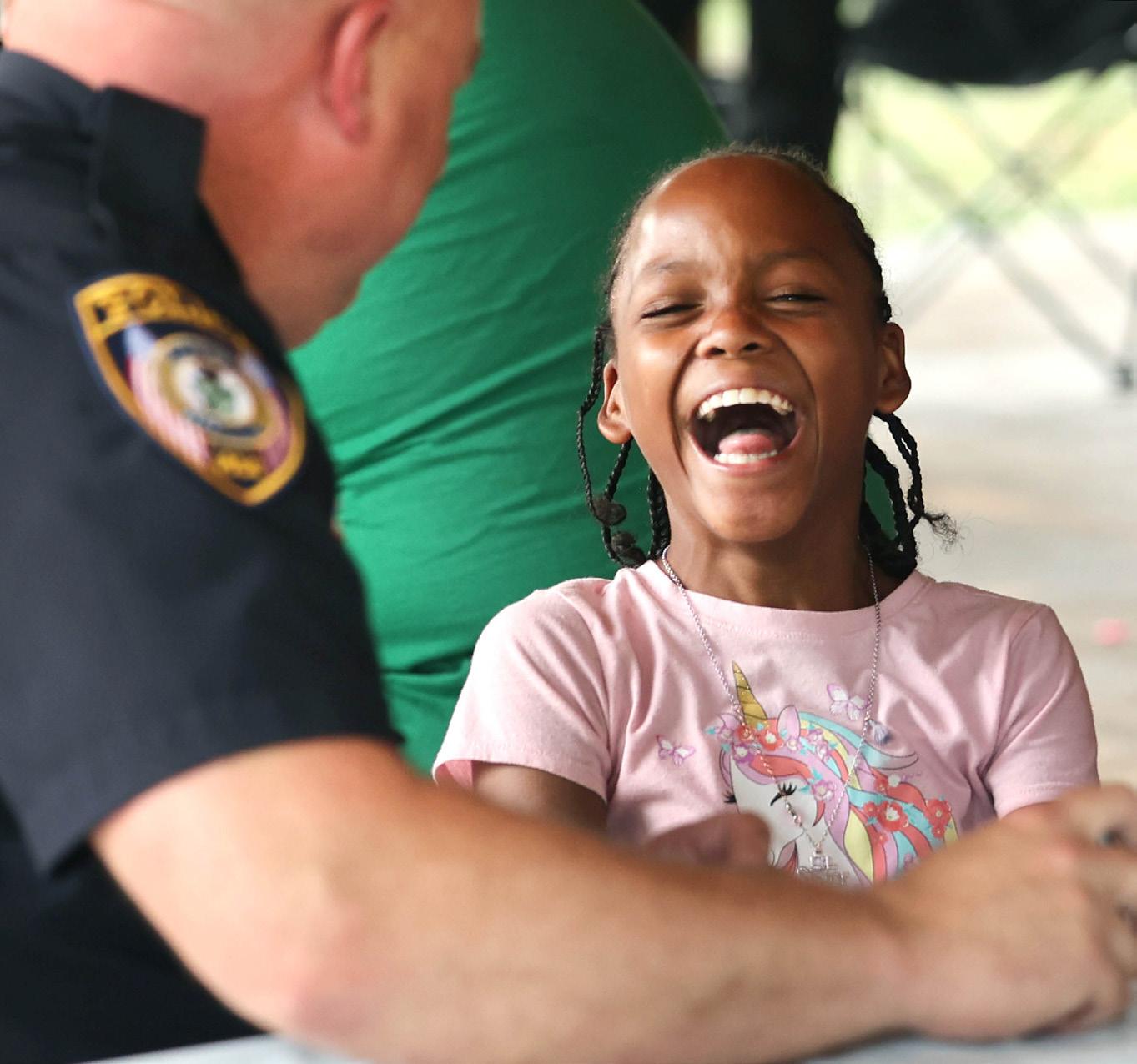 Mariah Cotton, 10, of DeKalb has a laugh June 27 with DeKalb Deputy Police Chief Jason Leverton during Fun Jam in the Park at Welsh Park in DeKalb.