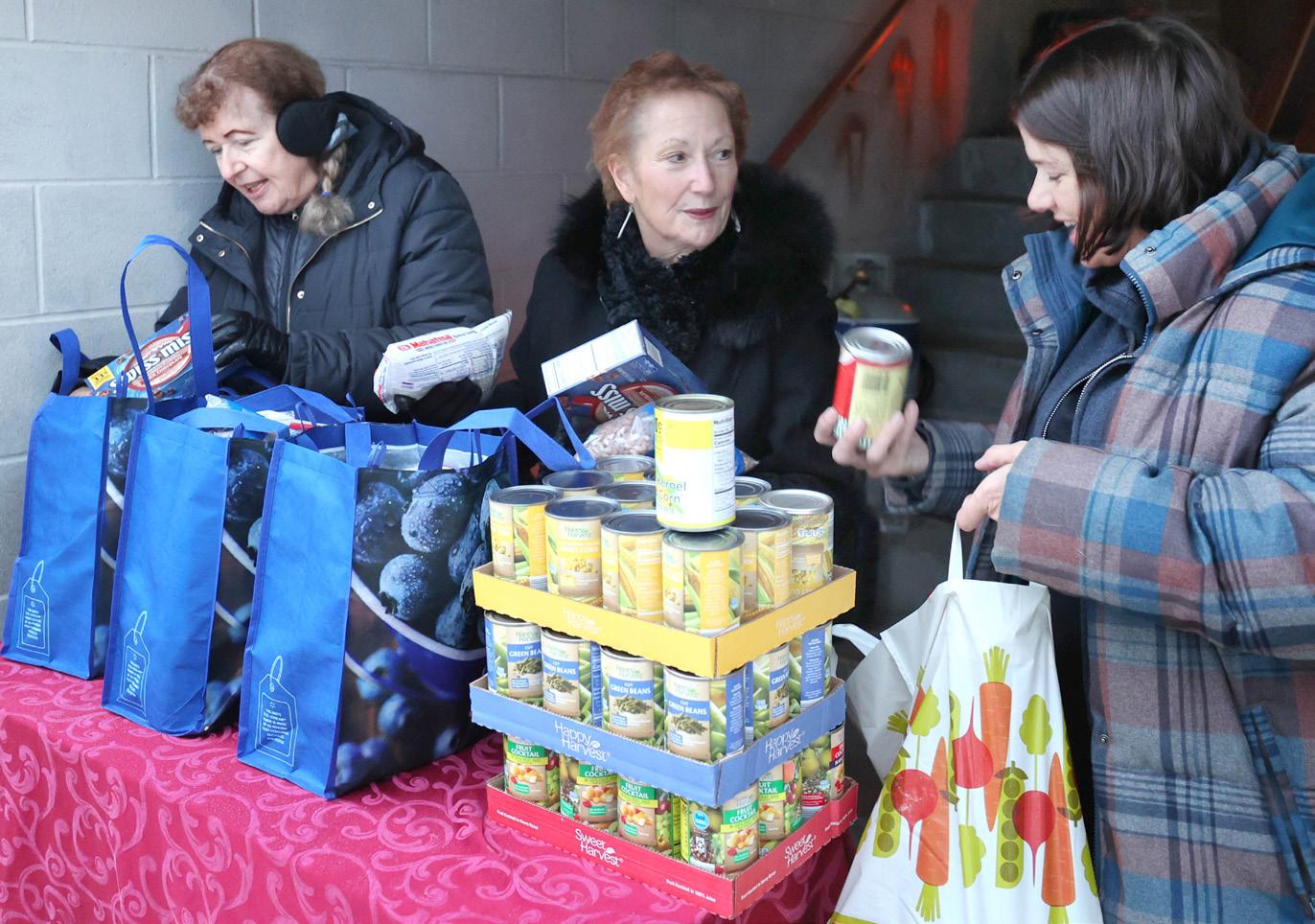 Stage Coach Players Outreach Committee members Deb Brubaker (left), Jan Kuntz and Angela Schiola (right) sort donations and pack bags Nov. 15, 2022, while collecting donations at the theater in DeKalb for their Thanksgiving food drive.