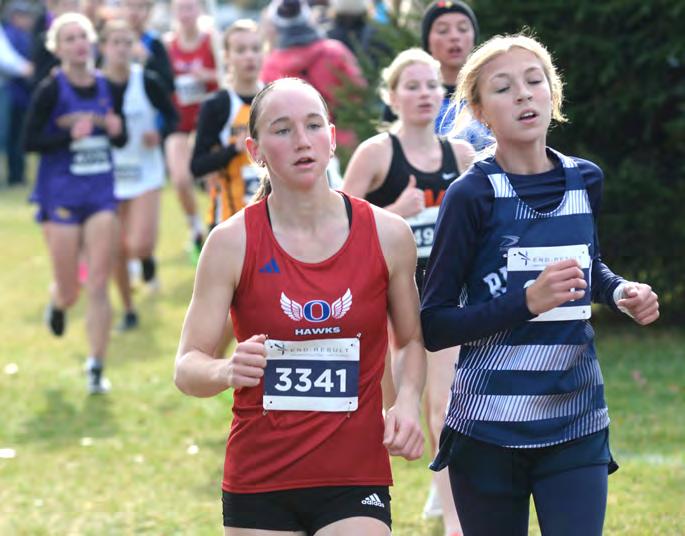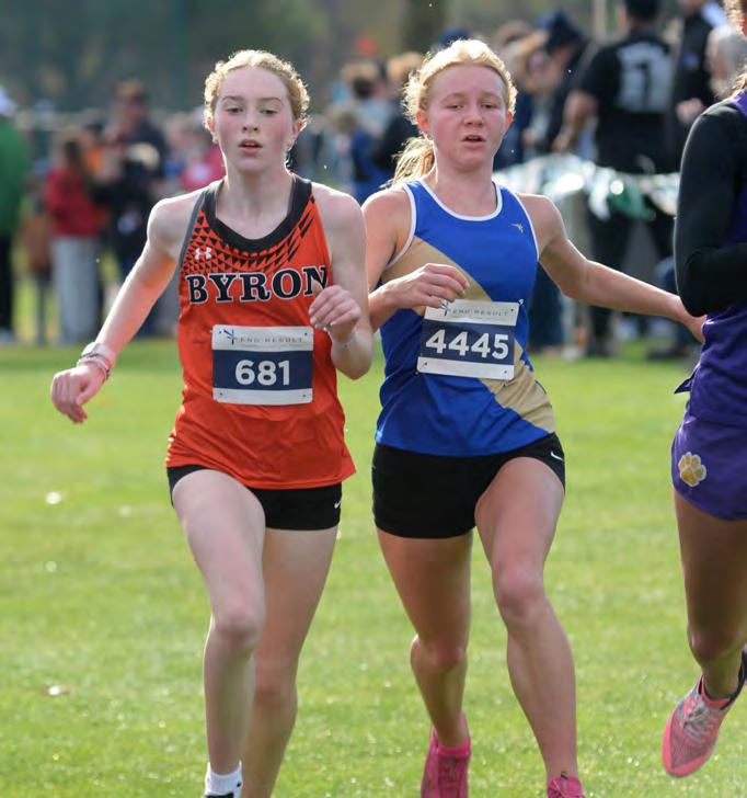 ABOVE: Byron’s Ashley Potter (left) races Rockford Christian’s Riley Fritz to the finish line at the Class 1A Rock Island Alleman Sectional on Nov. 2 at Saukie Golf Course in Rock Island.