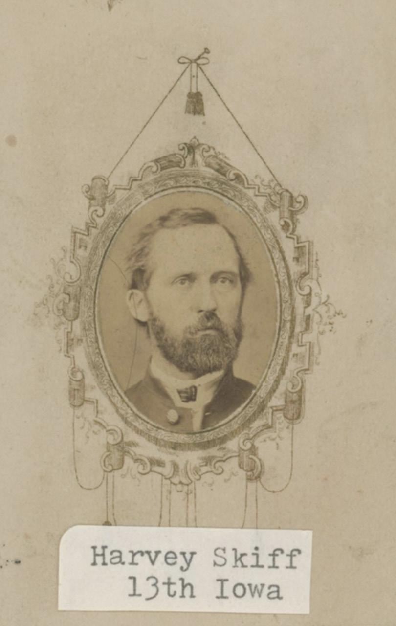 Skiff was engaged as a lawyer, banker, and land agent in Newton from 1851 to 1861, when he enlisted as Fifth Sergeant in Co. B, 13th Iowa Regiment of Volunteer Infantry. He was appointed Quartermaster Sergeant October 21, 1861, and served as Captain of the company from 1862 to 1864, succeeding T. H. Miller.