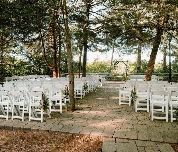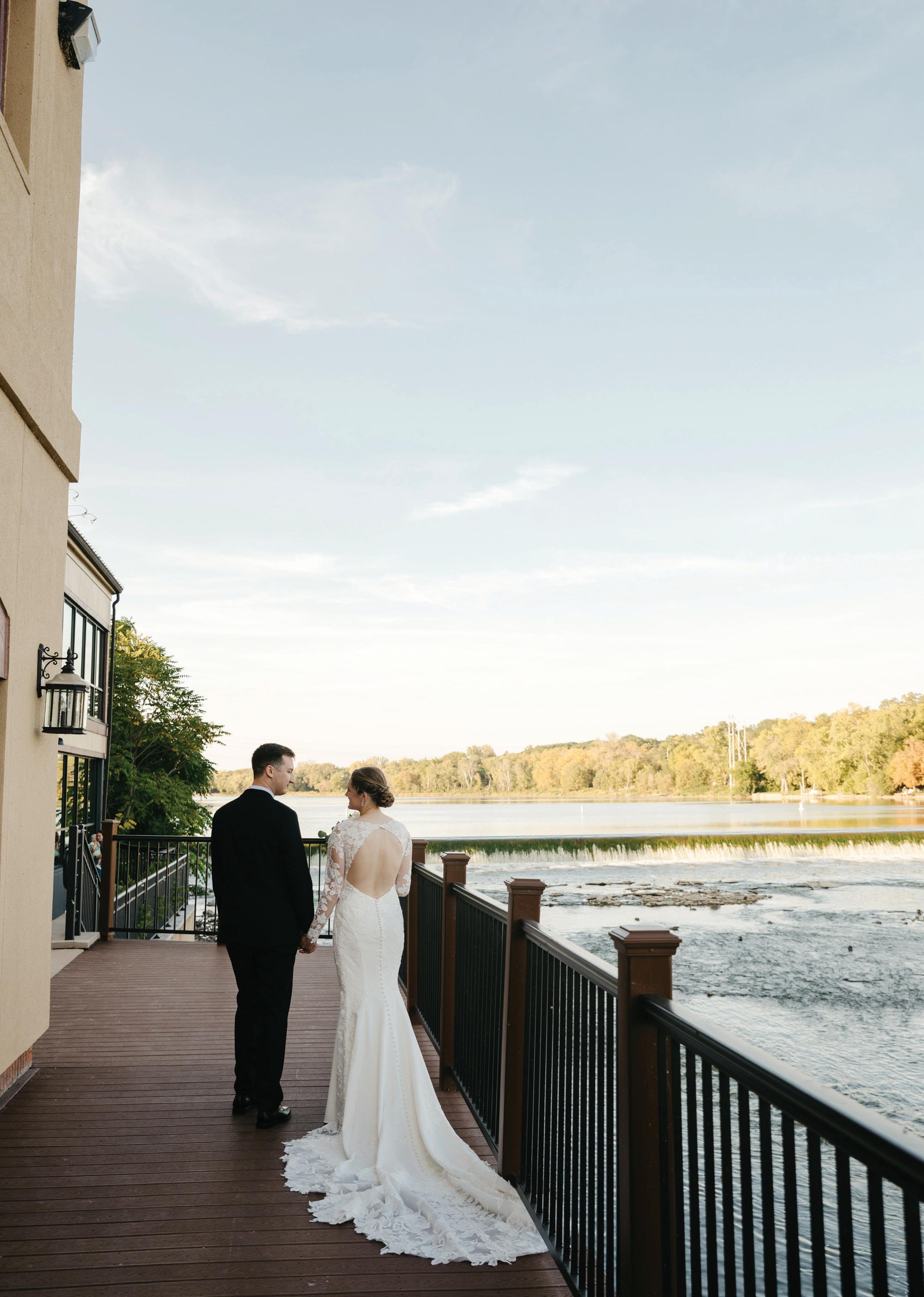 The river provides ample opportunities for creative wedding photos. Some, Drzonek recalls, included the groom fishing off the patio, and the bride and groom hopping into a canoe and paddling away. Drzonek has also seen Star Wars, disco, Halloween, and Bridgerton themes.