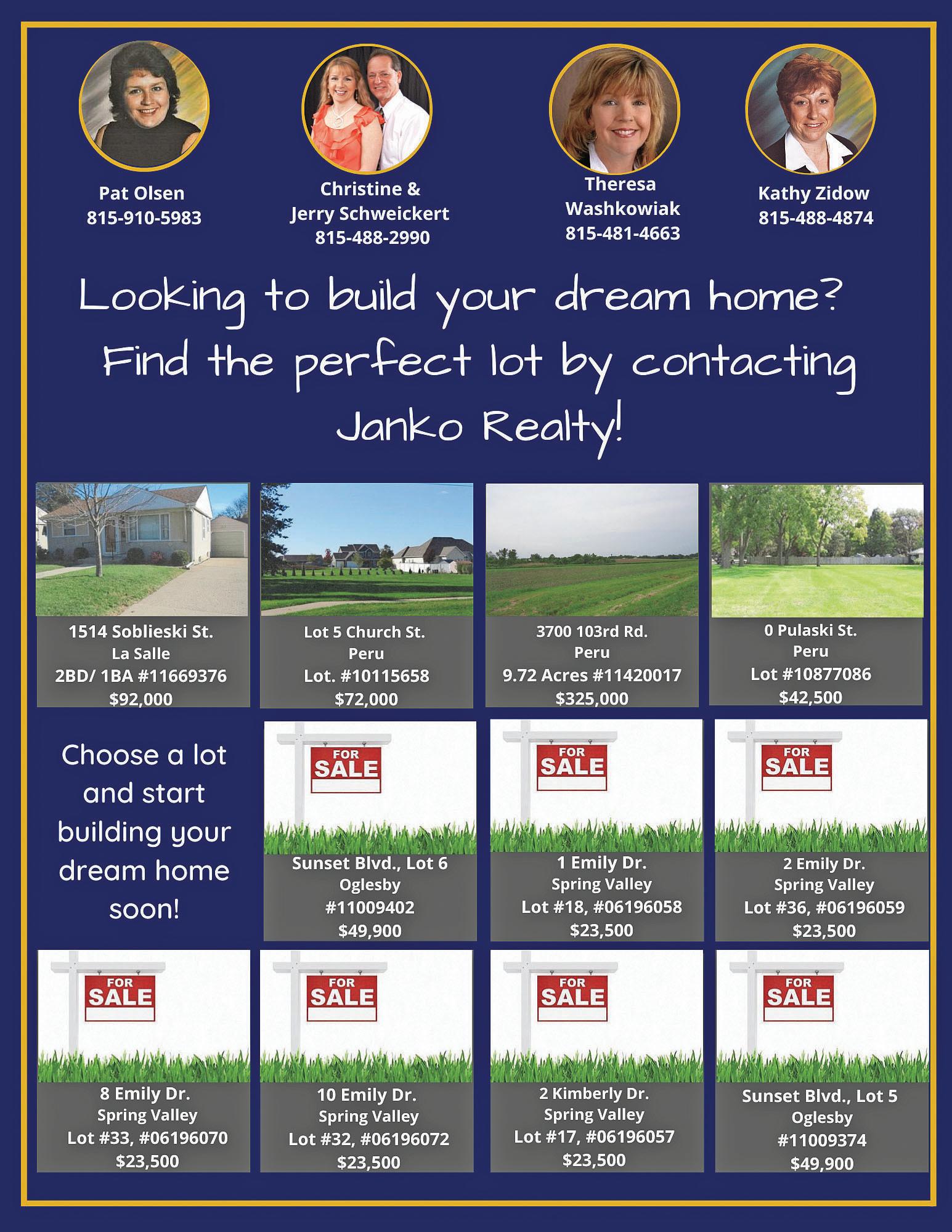 14 January 2023 | Illinois Valley Homes | A NewsTribune Publication Princeton-Affordable 3 bedroom, 1 bath ranch style home on large corner lot, 2 car garage. #11645572 $73,900 Peru-Move right in 4 bedroom, 1 bath home on large corner lot, 2 car attached garage. #11645611 $129,000 Spring Valley-Spacious 5 bedroom, 2 bath home, large front porch, 2 two car garage, scenic lot. #11690096 $169,900 Standard-Affordable neat 2 bedroom, 2 bath ranch home, 1+ attached garage, deck, patio. #11687286 $85,900 LaSalle -Low maintenance 3 bedroom, 1 bath home, open floor plan, fenced yard, shed. #11685117 $72,900 Peru -Lovely and spacious 2,144 sq ft, 4 bedroom, 1.5 bath home, original woodwork. #11679341 $134,995 Seatonville-Great home for country living features 4 bedrooms, 1 bath on corner lot, 1 car garage. #11642608 $114,000 LaSalle -Well-kept 3 bedroom, 2 bath home, 2 car garage, large yard, many updates. #11634976 $135,000 Peru -Lovely 2 bedroom, 1 bath home, 1 car garage, shed, maintenance free vinyl siding. #11674972 $92,500 Granville-Cozy 3 bedroom, 1 bath home on large corner lot, 2 car garage, storage shed. #11673512 $92,500 Henry-Lovely 2 bedroom, 2 bath home on well manicured corner lot, 1 car garage, concrete patio. #11670632 $190,000 Peru-Charming stone and brick 3 bedroom, 1 bath home on large scenic lot, partially fenced yard. #11667194 $198,500 Wenona-Nice 3 bedroom, 1 bath Farmhouse style home on nice lot with mature trees, 2 car garage. #11664195 $90,000 Peru-Spacious 4 bedroom 2 bath home, 1 car garage, large covered front porch, back deck. #11663986 $145,000 DePue -Ranch home has 2 bedrooms, 1 bath, kitchen has plenty of cabinets, covered patio, shed. #11654301 $42,500 Spring Valley-Fixer Upper features 3 bedrooms, 1 bath home, fenced back yard, off alley parking, shed. #11662670 $59,900 Wenona-Very cute 2 bedroom, 1 bath ranch home, shed, creek at rear of property, fenced yard. #11659042 $110,000 Mendota-Charming 4 bedroom, 1.5 bath home on large corner lot, 1 car garage. #11679058 $130,000 LaMoille -One story home with 2 bedrooms, 1.5 bath, 2 car garage, outbuilding with gas line. #11677523 $144,900 LaSalle -Immaculate, 3 bedroom, 1 bath home, hardwood floors, enclosed back porch. #11672803 $110,000 815-223-1088 coldwellbankertoday.com Jaimie Bazydlo Janet Benvenutti Nathan Byers Wendy Fulmer Robin Guerrero Pietro Alfano Chris Hopps