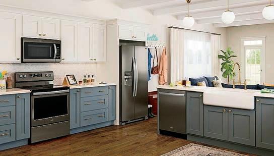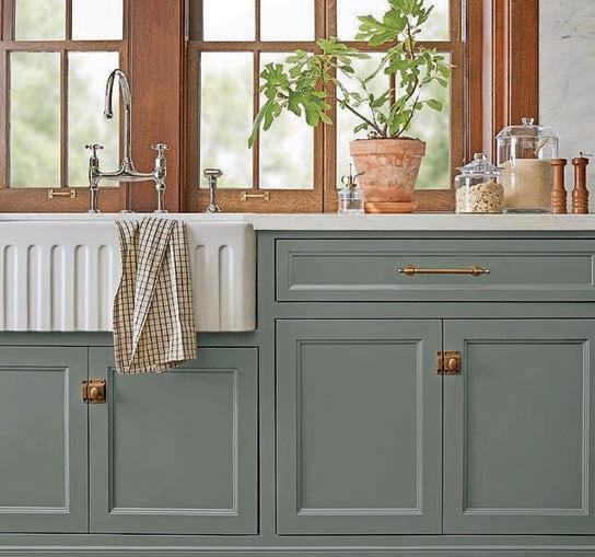 Large appliances and xtures. Go for it! Stainless steel reigned supreme for years, but color is the emerging trend in kitchen appliances now. Major, high-end appliance manufacturers are offering lines in many shades of green, from light and subtle to dark and dramatic. But with this trend, you don’t have to go all in at once. One statement piece, like a deep teal farmhouse sink within a white countertop, is a showstopper.