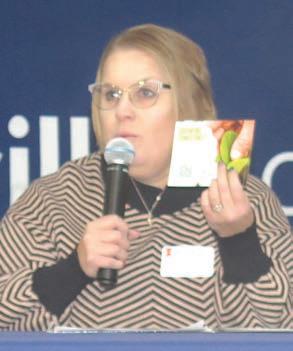 Stephanie Porter, Illinois Soybean Association outreach agronomist, shows a card with information on ISA’s Soybean Production Concerns Survey