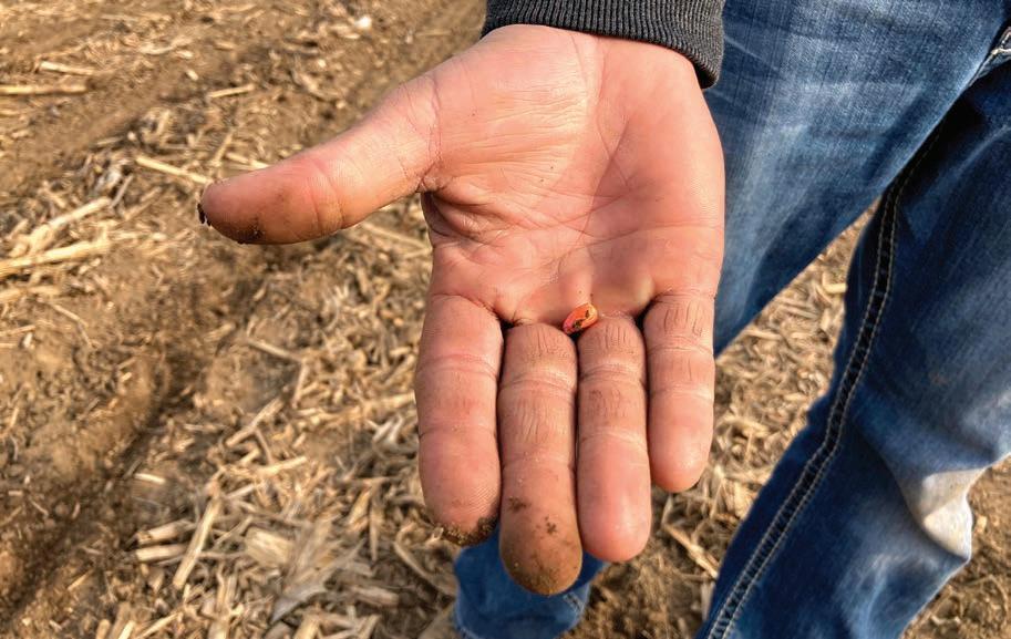 A farmer holds a corn seed to be planted in one of his fields where he uses minimum tillage practices to improve yields and keep more carbon stored in the soil near Carlisle in western Indiana
