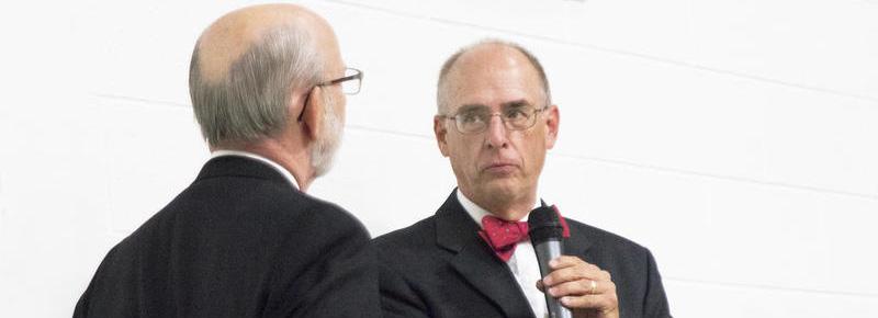 Brion Brooks, executive director of the Village of Progress, speaks with Tom Wadsworth (left) during the Village of Progress 49th annual banquet at the St. Mary’s Parish Center in Oregon.