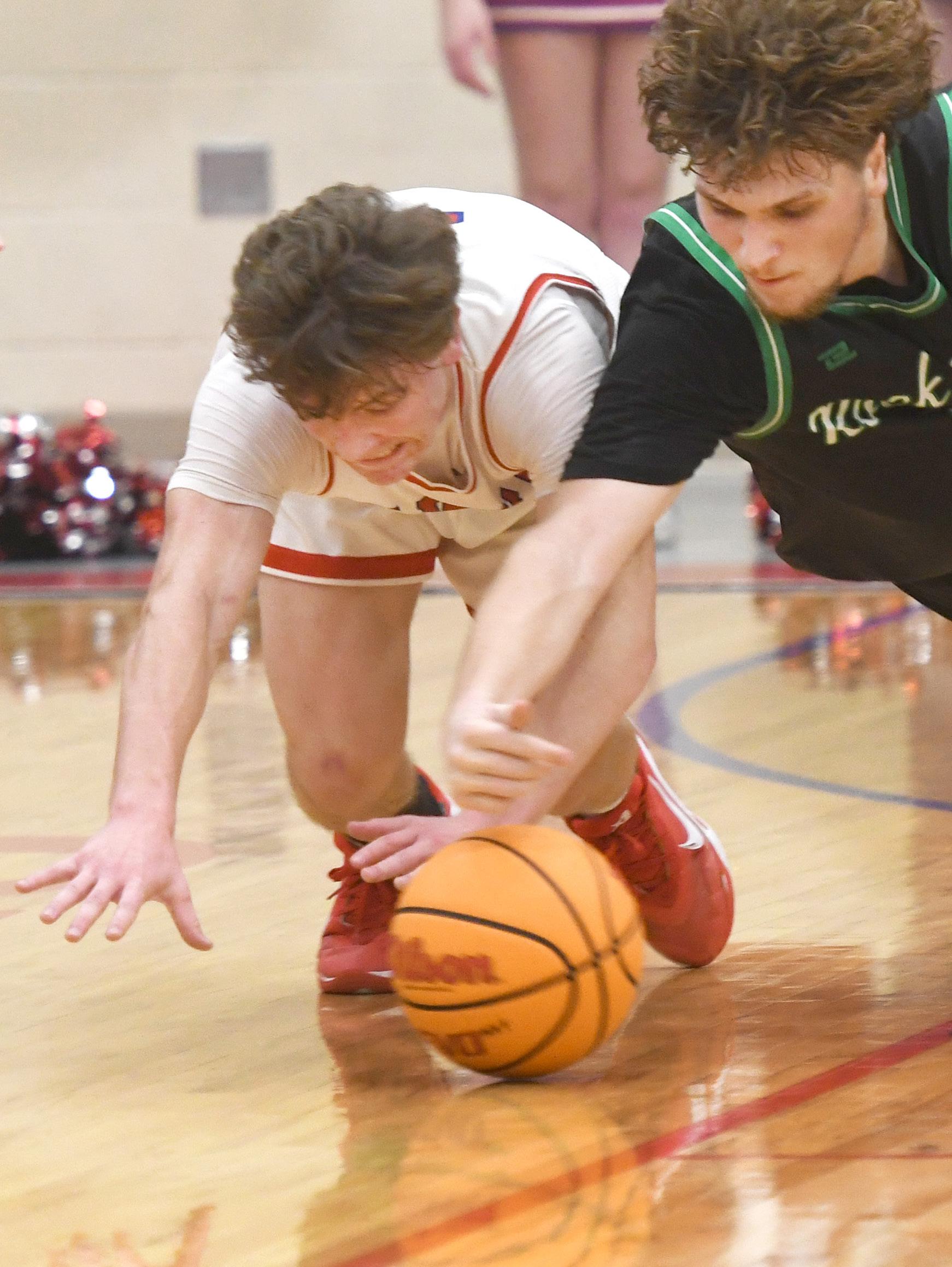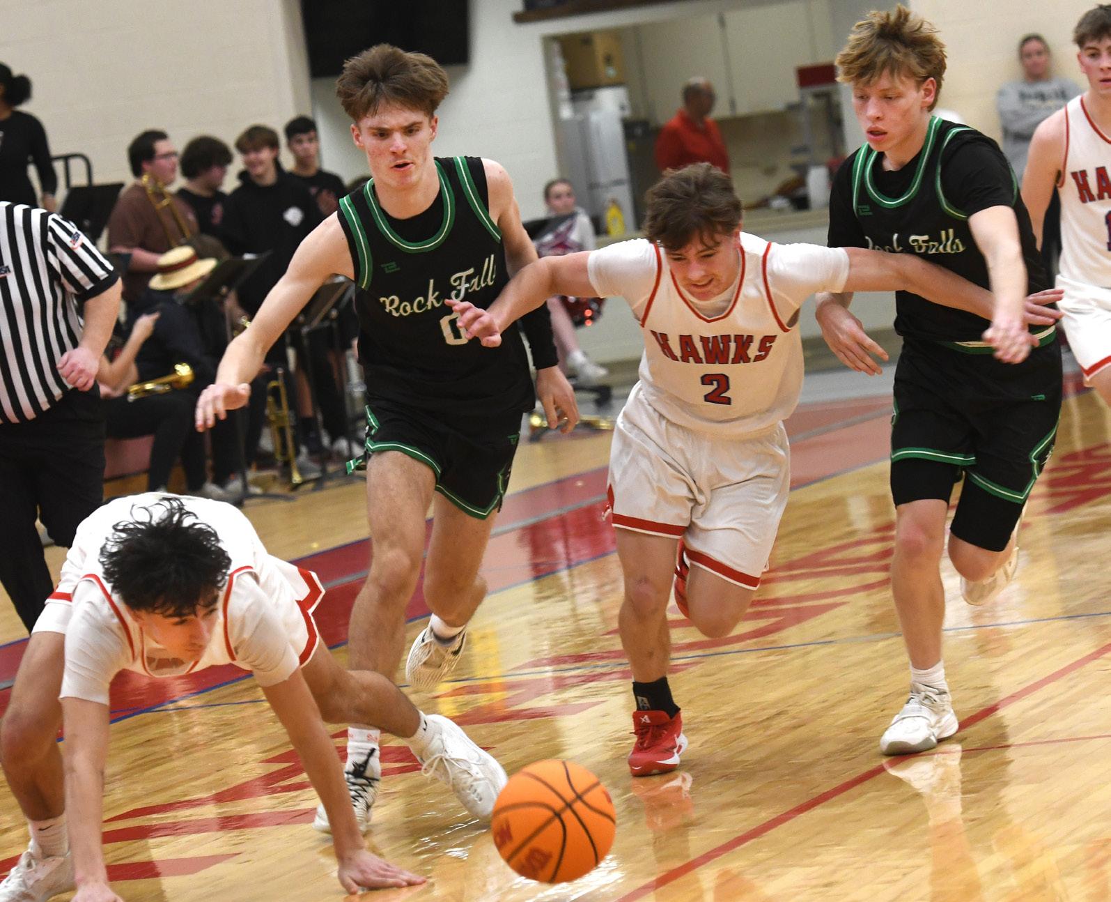 TOP LEFT: Oregon’s Cooper Johnson (2) shoots a lay up as Rock Falls’ Max Burns (0) looks to rebound on Jan. 9 at the Blackhawk Center in Oregon. TOP RIGHT: Oregon’s Benny Olalde (1) and Cooper Johnson (2) battle Rock Falls’ Max Burns (0) and Owen Mandrell (24) for a loose ball. ABOVE: Oregon’s Brian Wallace (15) knocks the ball away from Rock Falls’ Cole Munix (12) during action. LEFT: Oregon’s Cooper Johnson (2) and Rock Falls’ Cole Munix (12) dive for a loose ball.
