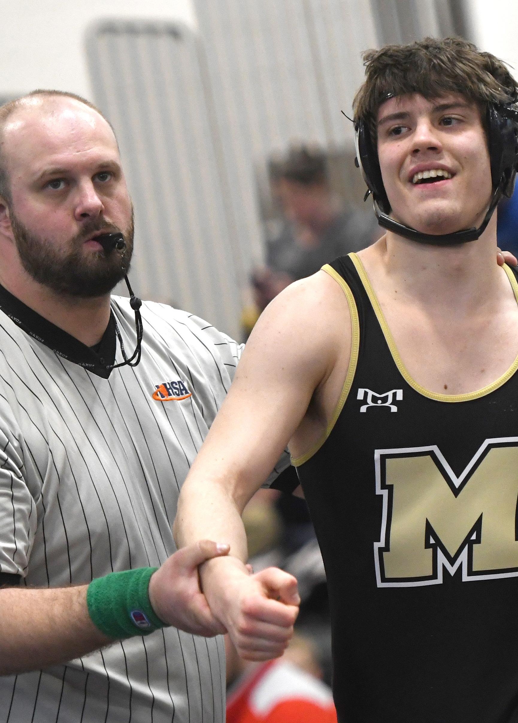 TOP LEFT: Oregon’s Nelson Benesh (left) wrestles Freeport’s Thomas Olson in the 138-pound championship match at the Polo Wrestling Invitational on Jan. 10, at Polo High School. TOP RIGHT: Oregon’s Josiah Perez battles Guilford’s Dominc Angileri in the 120-pound championship match at the Polo Wrestling Invitational on Jan. 10, at Polo High School. ABOVE: Oregon wrestlers took second place at the Polo Wrestling Invitational on Jan. 10, at Polo High School. LEFT: Polo’s Micah Stringini smiles as he looks to the crowd after pinning Yorkville Christian’s Kenny Fox in the championship match at 190 pounds at the Polo Wrestling Invitational on Jan. 10, at Polo High School.