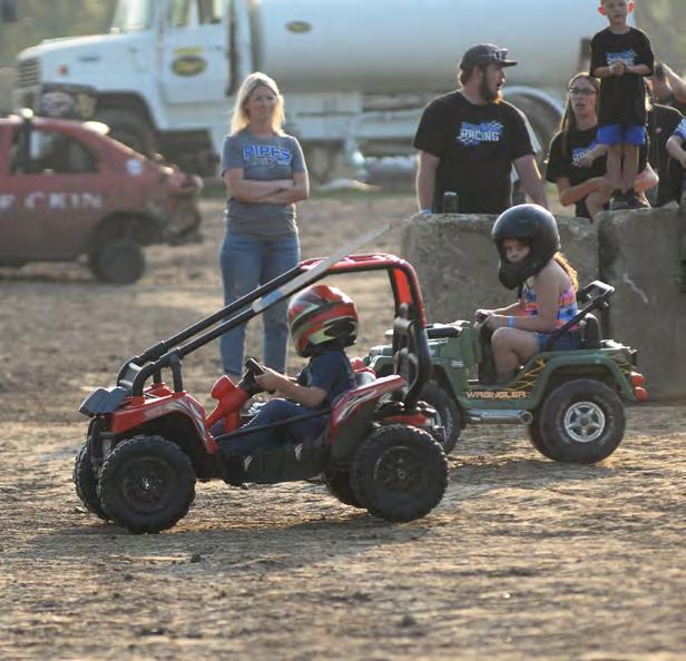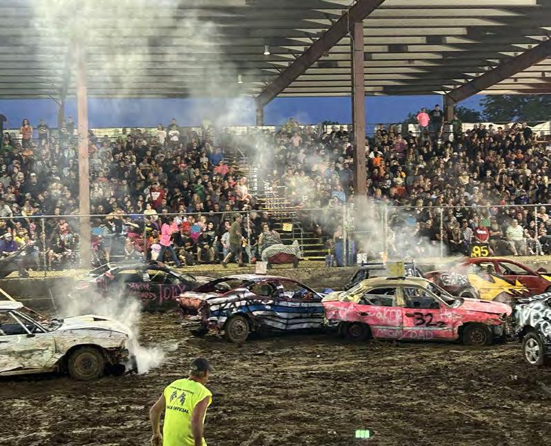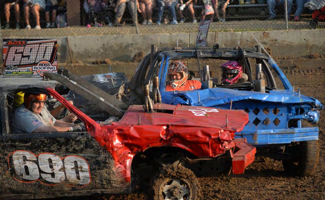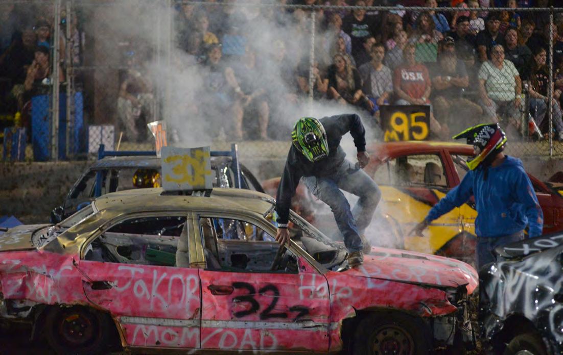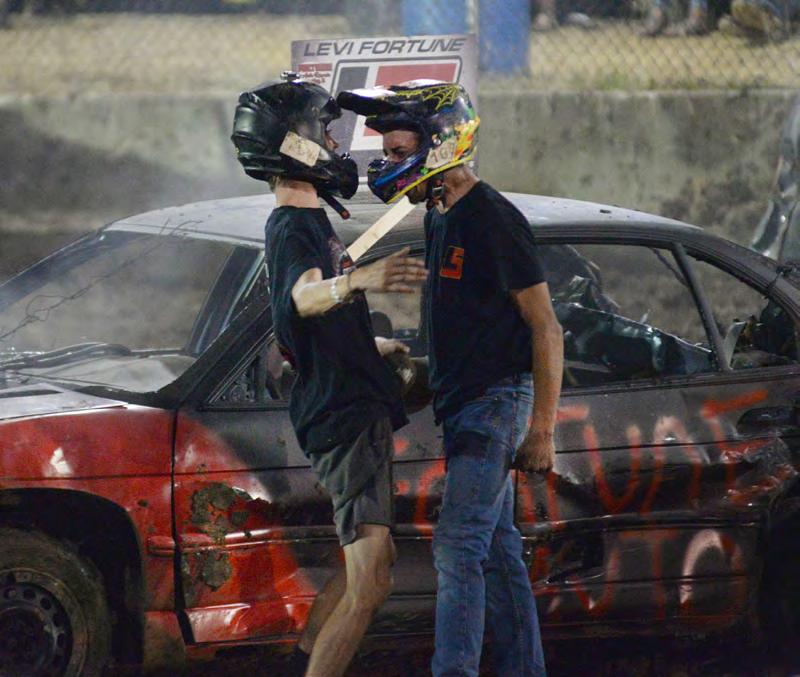 TOP LEFT: Ethan Bocker of Forreston takes a hit in his car (51) in the Compact Heat during the Ogle County Fair demolition derby on Saturday. TOP RIGHT: The grandstand was packed Saturday for the demolition derby at the Ogle County Fair. ABOVE: Levi and Buddy Fortune, both of Sterling, celebrate after finishing first and second Saturday in the Compact Heat at the Ogle County Fair demolition derby. LEFT: Cooper Sasso of Garden Prairie races to a first-place finish in the kids power wagon sprint before the start of the demolition derby at the Ogle County Fair on Saturday.