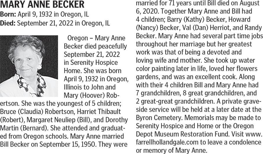 VOLUME 172NO.31•SERVINGOGLE COUNTYSINCE1851 Friday, September30, 2022 •$1.00 Onesection• 20pages AOPPREP INDEX Betty’s Column........6 Classifieds........18-20 ColbertColumn......14 LibraryNews ............2 Oregon Police..........17 Otto’s Column..........6 Property Transfers..16 Sheriff Activity........16 Sports................. 10-15 DEATHS NEWS NEWS FundraiserPlanned Checkoutthevintage railcarand helpits restorationeffort. /8 Sports Forrestonand Polopost footballwins,butOregonloses to Rockford Lutheran. /12-13 BidsSought OgleCountyisseekingbids to demolishits formerjail. /4 Published every Friday by OgleCountyNewspapers, adivision of ShawMedia MaryAnne Becker, Lester LeeMathews,ArleneB.Cianciarulo, Page7