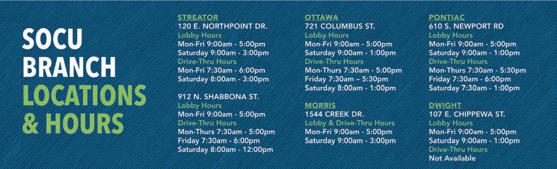 As SOCU looks ahead to the next chapter of our story, we do so with optimism and excitement, confident the successes of the past will pave the way for an even brighter future. Please join us as we celebrate each branch this summer for a special member appreciation day. Celebrations will be June 21st at the Streator-Northpoint Branch, June 28th at the Pontiac Branch, July 12th at the Ottawa Branch, July 19th at the Dwight Branch, and August 23rd at the Morris Branch in conjunction with our new building’s Grand Opening.