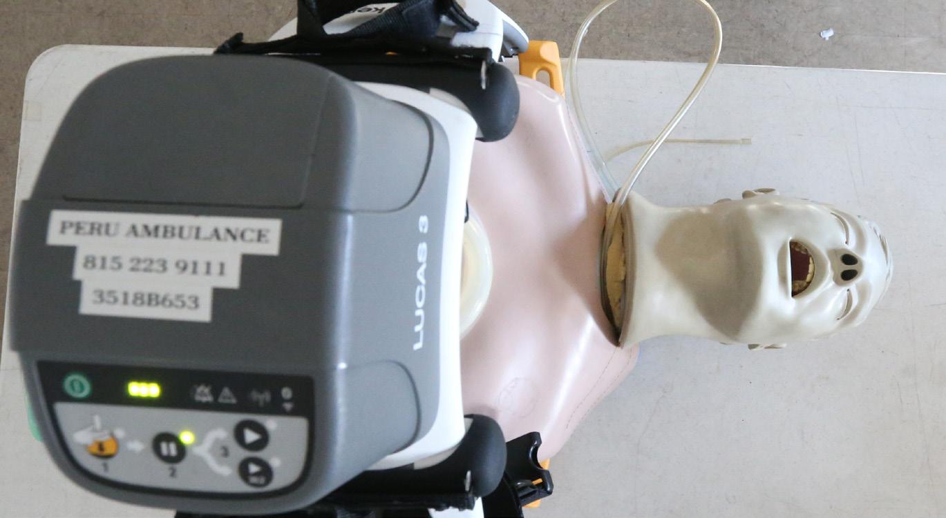 A mechanical chest compression device known as Lucas 3 made by Stryker applies automatic pressure on the chest on a mannequin on Tuesday, Jan. 10, at Peru EMS. The device maintains chest compressions hands free during transport to advanced lifesaving therapies.