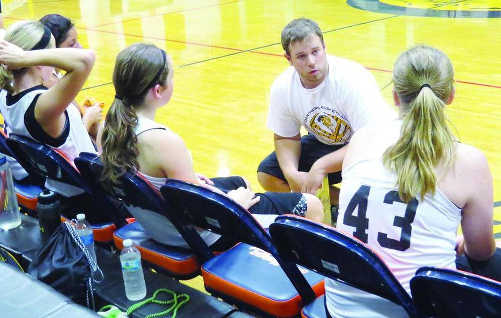 Putnam County girls basketball coach Jared Sale talks to his team during a summer game. Sale became the program’s career coaching wins leader with a win over Seneca on Monday. He has 108 career wins.