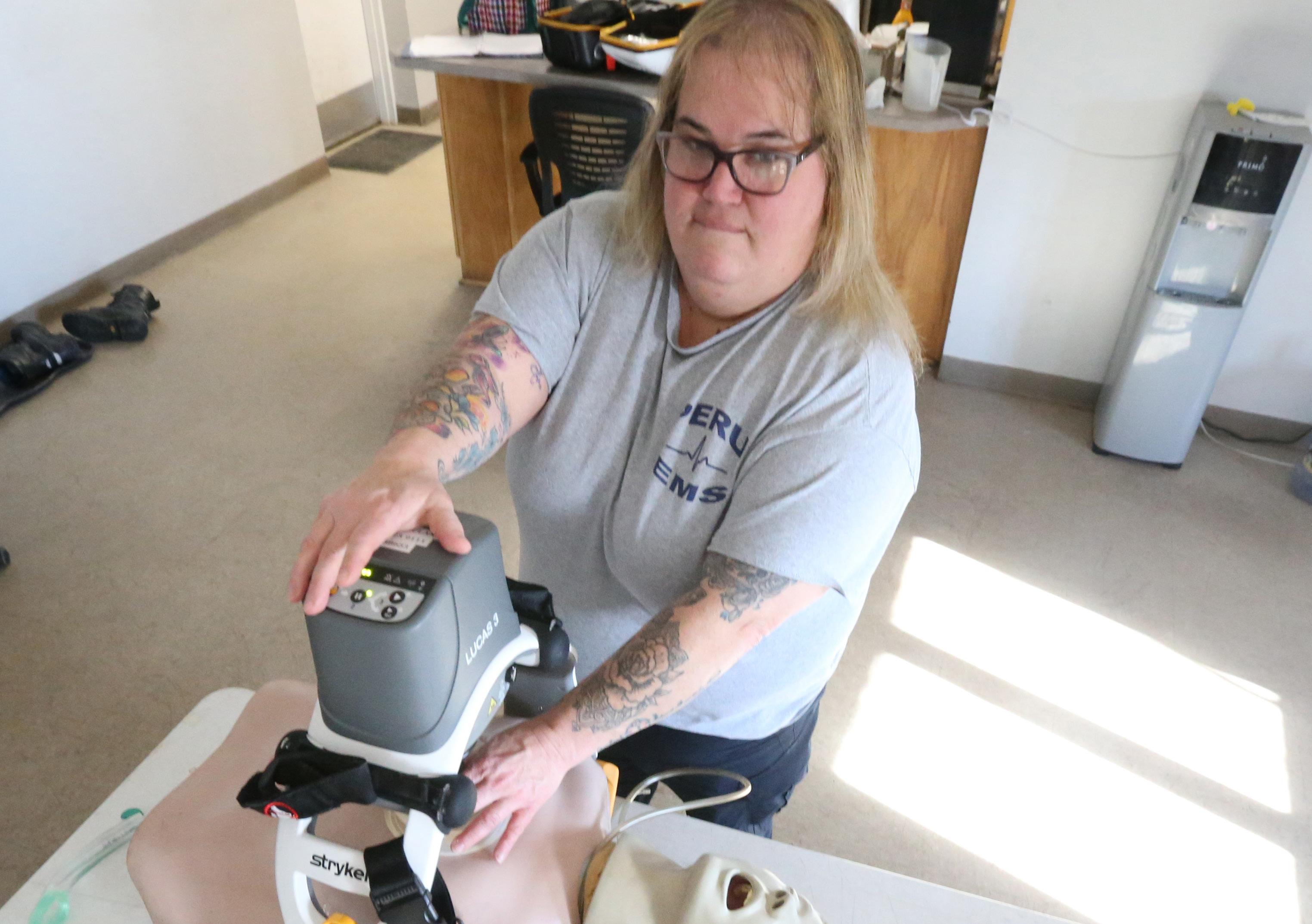 Peru paramedic Bonnie Hartman uses a mechanical chest compression device known as Lucas 3 made by Stryker on a mannequin Tuesday, Jan. 10, at Peru EMS. The device maintains chest compressions hands free during transport to advanced lifesaving therapies.