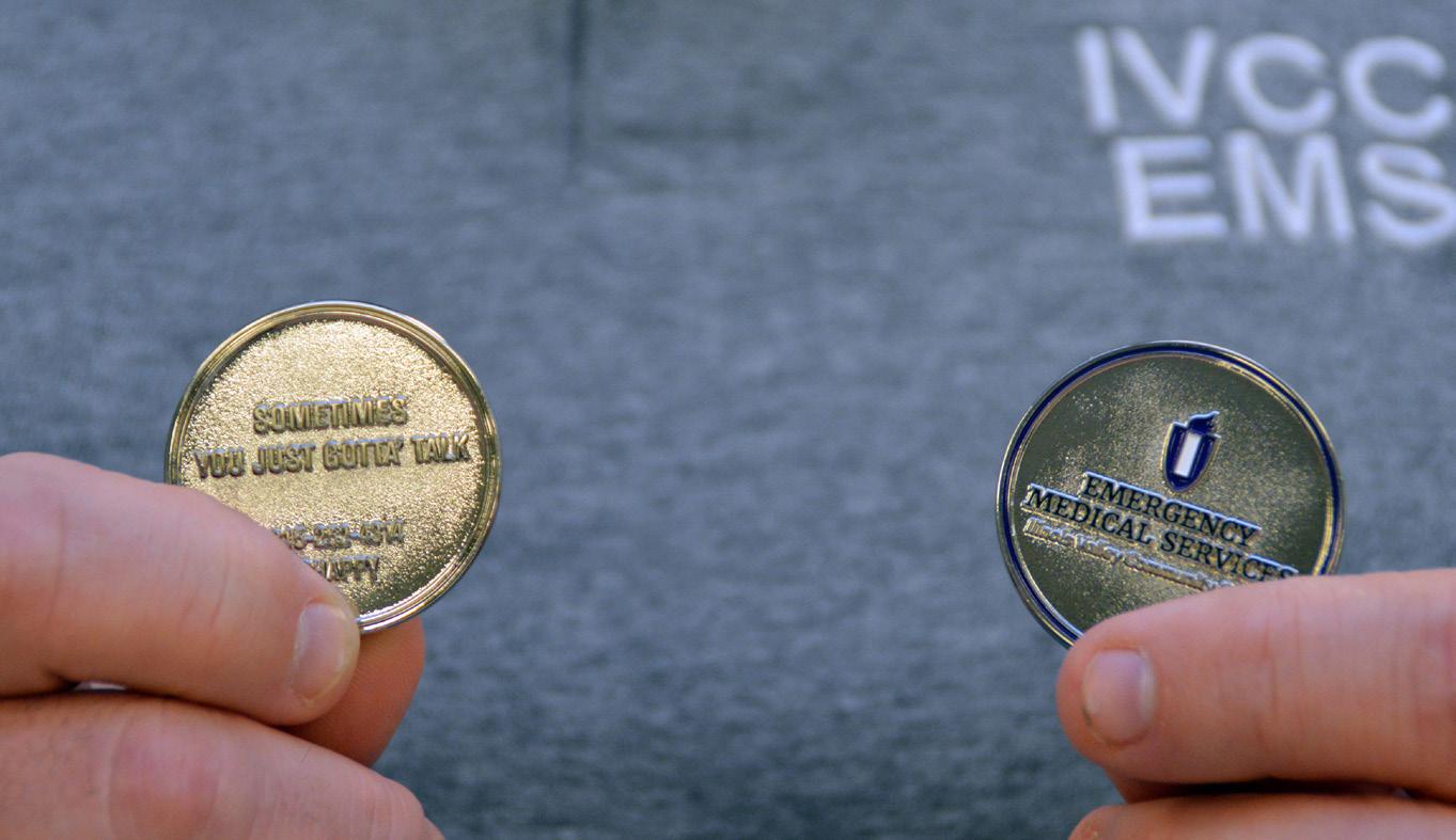 IVCC’s brass Challenge Coin resembles others in that one side features the emergency services program and the IVCC shield. But the flip side strays from tradition – it contains a phone number, a name and the invitation, “Sometimes you just gotta talk.”