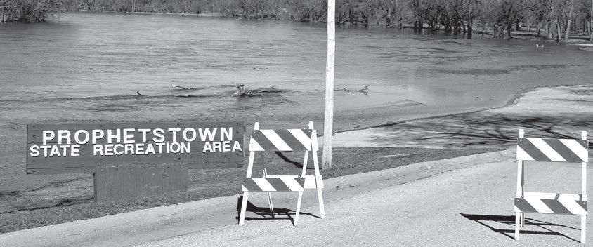 Last week’s spring storms brought highwinds, hail, power outages and a deluge of rain to the area, witha flood warning issued for the Rock River until Monday, April 10. Barricades were blocking the entrance to Prophetstown State Park on Thursday, April 6, as the water continued to rise and cover the parking lot and campground entrance The water is expected to recede to normallevels by the end ofthis week.