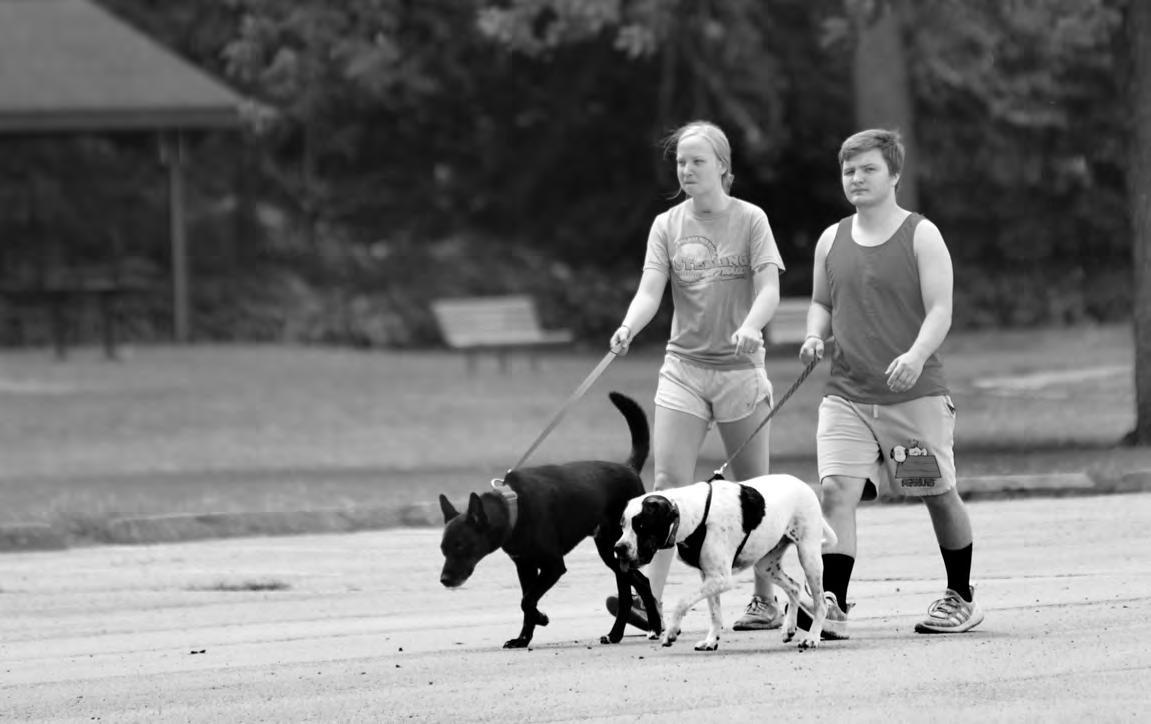 Damion Thompson and Danielle Dejonge took advantage of the mild summer weather Saturday to walk their dogs Duke and Rex at Prophetstown State Park. Hot and humid weather was forecasted to return this week.